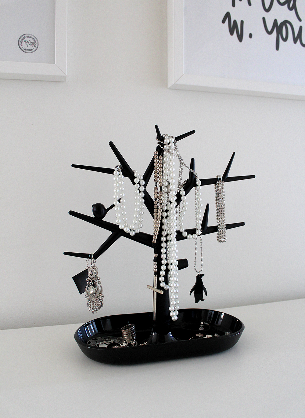 Löytyi aika hauska ja toimiva teline koruille, joka sopii hyvin mustavalkoiseen graafiseen sisustustyyliin. Teline on funktionaalinen; sormukset ja muut pienemmät säilyvät alaosan kipossa, ja kaulakorut voi ripotella eri oksille. Yksityiskohtana oksalla kökkii lintunen.
