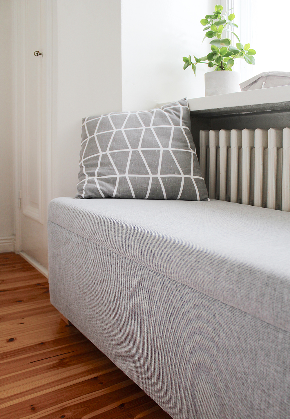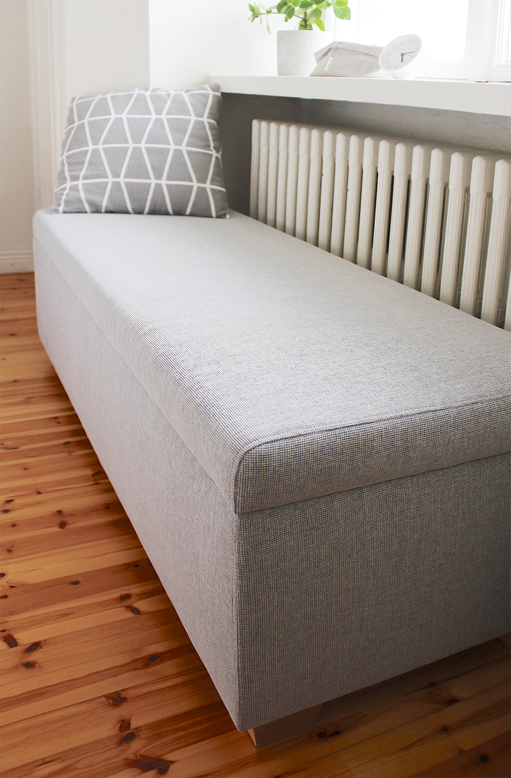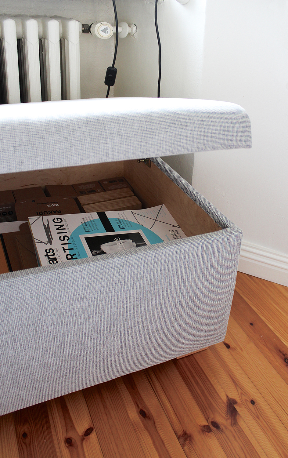 Sisustustavaratalo ON24 yllätti taas positiivisesti, kun sieltä löytyi kauttaaltaan täydellisen mittainen rahi. Nyt ei enää tarvitse lattialle heitellä vaatteita, vaan viikkaillaan siististi rahin päälle (hope so..). Siinä on mukava myös istuskella patterin lähellä lämmössä.