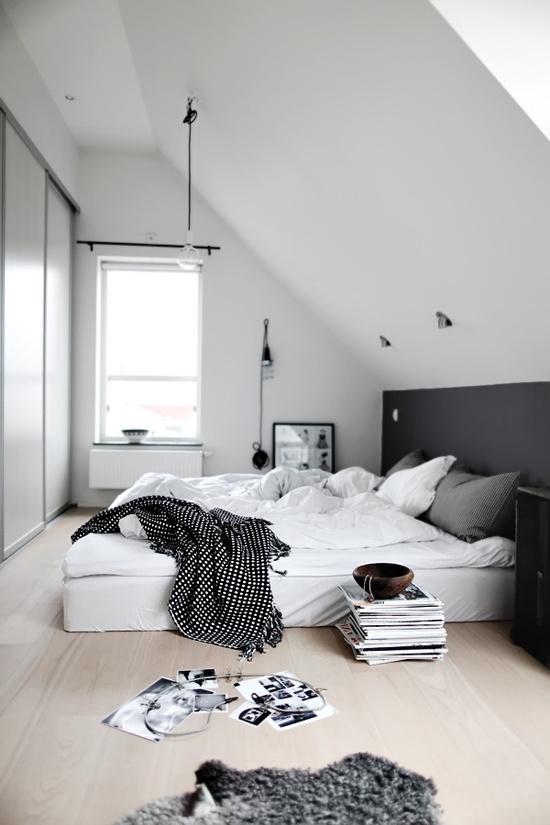 Mustavalkoinen sisustus makuuhuoneessa. Vaikka sänky on myllättynä, tavaraa lattialla ja somistus keskeneräisen oloinen, näyttää kokonaisuus todella hyvälle. Luonnonvalolla on osuutta asiaan, tai harkitulla stailauksella ja hyvällä valokuvalla. Vino seinä luo skarpin ja persoonallisen tunnelman tilaan.