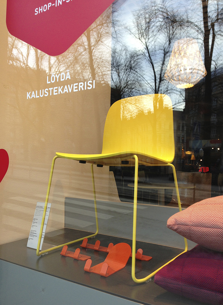 Haluaisin piristää mustavalkoista sisustustamme pienillä värielementeillä. Niin, siis minä, joka ei voi sietää värejä. Pelkästään mustavalkoharmaata viimeinen vuosikymmen… Noh, sain innostuksen tästä tuolista, jonka bongasin Design Forum Finlandin ikkunassa: