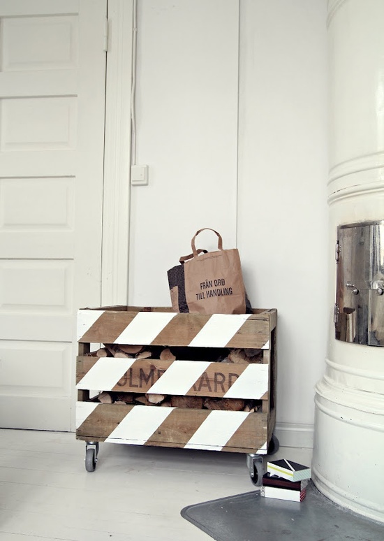 Tosi hauska klapien säilytyskärry! Näyttää itsetehdyltä, onkohan? Puulaatikko, raitamaalaus ja rullat alle. Pönttöuunin vierellä näyttää veikeältä kokonaisuudelta. Huomaa graafiset tulitikkuaskit vierellä :)