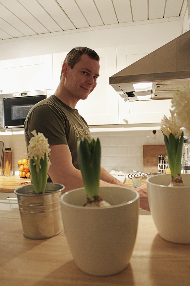 Veimme aattona uusille naapureille suklaiset joulutervehdykset ovelta ovelle. Kokkasimme yhdessä jouluruokia, saunoimme pitkän kaavan mukaan ja pelasimme lautapelejä. Hyasintit tuoksuivat ympärillä.