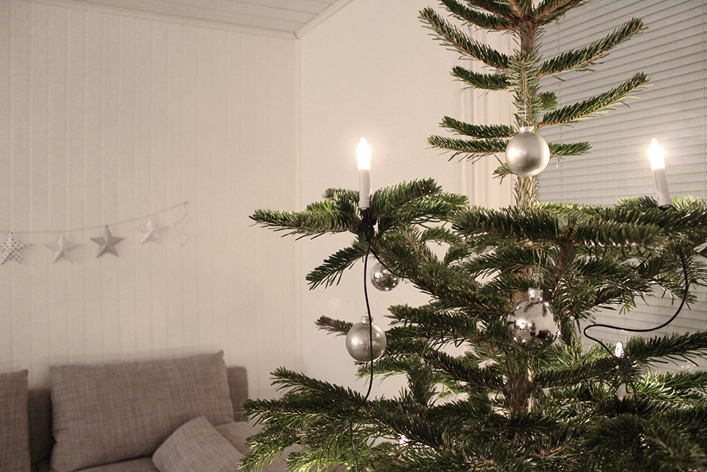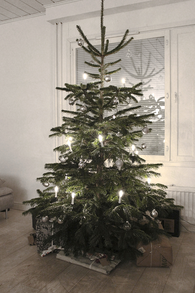 Niinpä pääsimme rauhoittumaan joulunviettoon jo hyvissä ajoin uudessa kodissamme. Mies haki meille upean joulukuusen ja koristeli sen. Minä seurasin vierestä ja vähän kiusallani naureskelin hänen ostamille kasarijouluvaloille. Mutta kyllä tuli komea kuusi! Simppelisti hopeisia palloja sekä jouluvalot, ei se muita koristeita kaivannut.