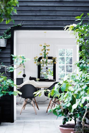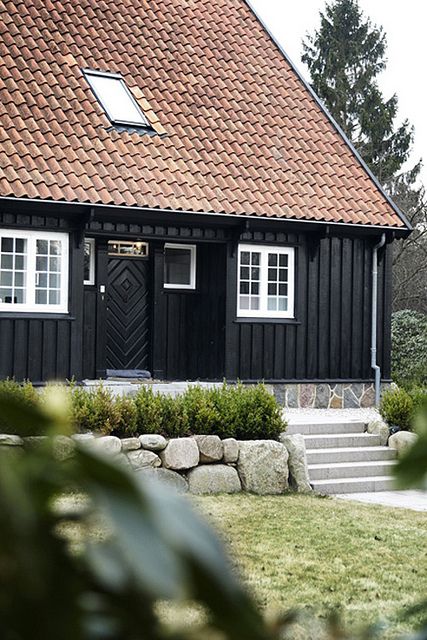 Olen jo aiemmin keräillyt fiiliskuvia muutamien talojen ulkoasuista ja iloikseni huomasin, että tuo tyyli on ihan kuin meidän talossa! Olen tykästynyt moderneihin ja vanhoihin puutaloihin. Omamme on 70-luvulta. Kuvia selatessa vahvistui ajatus siitä minkälaista viimeistelyä haluan tehdä, tai siis tietysti sen mukaan mikä on mahdollista. Talon väriksi tulee matta musta ja raamit pidetään valkoisena.