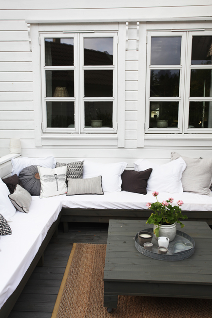 Terassin reunoihin voisi rakentaa L-muotoon penkit, jatkuen yhtenäisesti terassilaudasta. Penkit olisi siinä aina, eikä tarvitsisi huonon sään aikan raahata varastoon. Tyynyillä saa ilmettä ja istuinpehmusteilla mukavuutta.