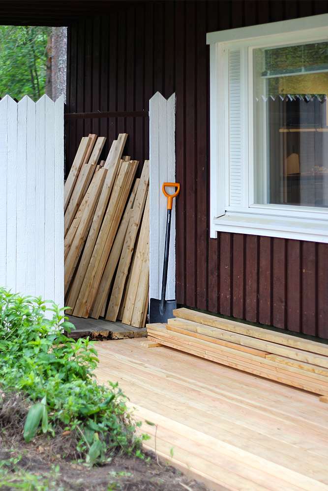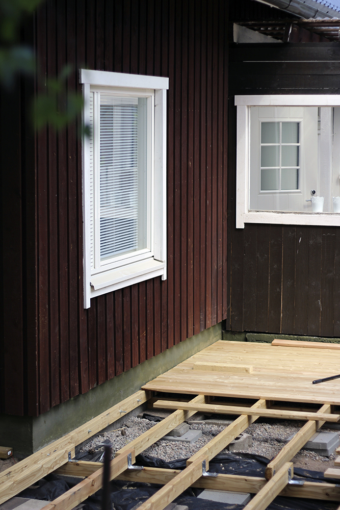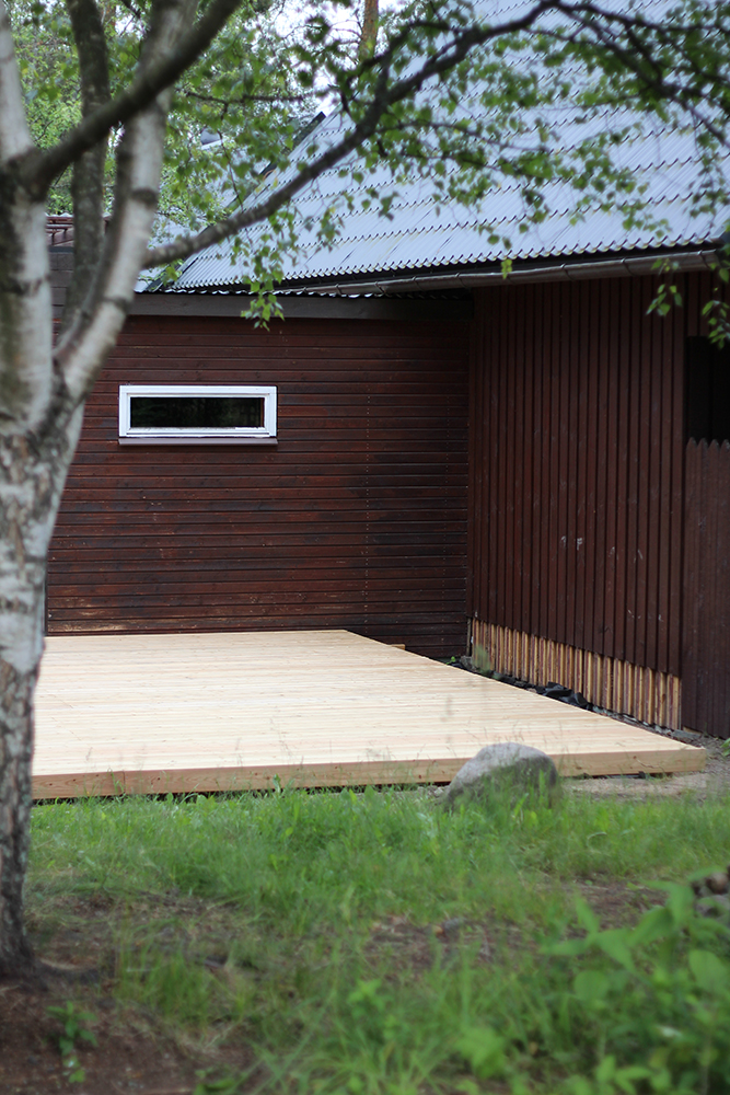 Terassi alkaa saada näköä, kun kansilautoja on asennettu paikoilleen. Puuvalinta tuntuu kyllä todella oikealta. Puu on lehtikuusta, joka harmaantuu ajan kanssa. Sitä ei tarvitse käsitellä mitenkään, ellei nyt halua puun värin pysyvän nykyisellään.