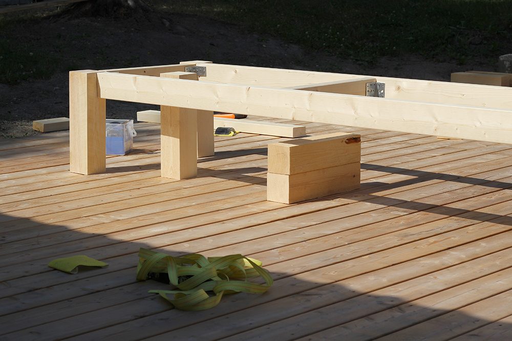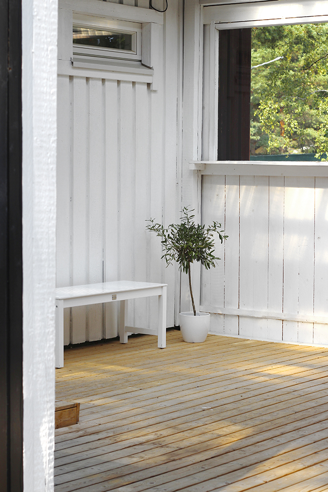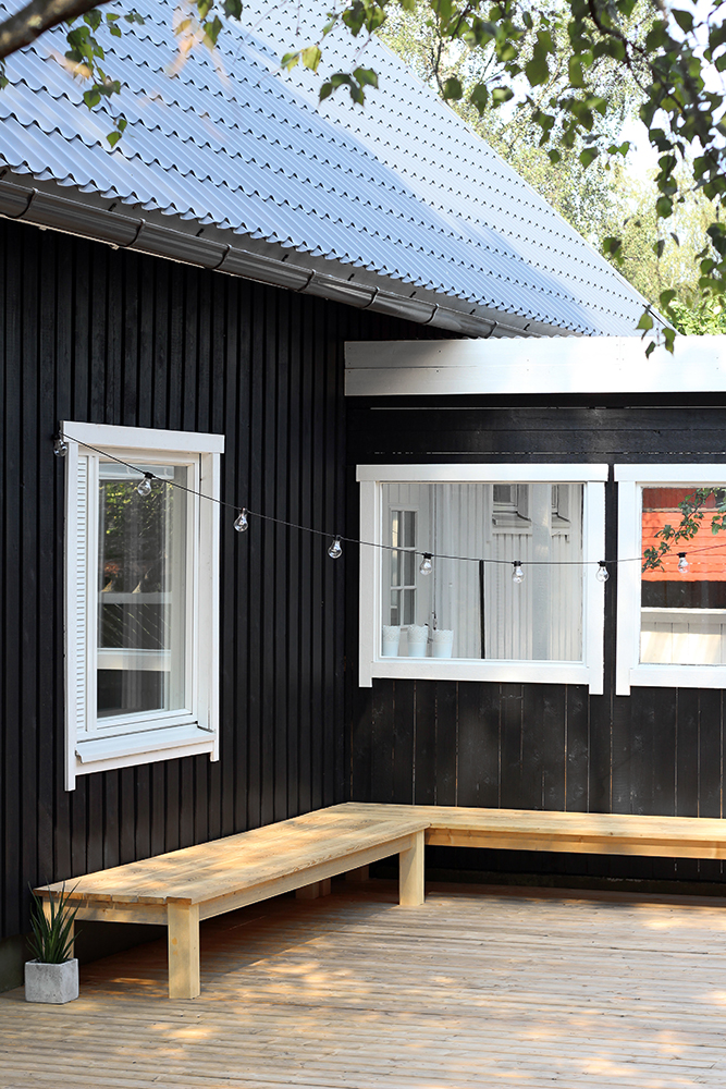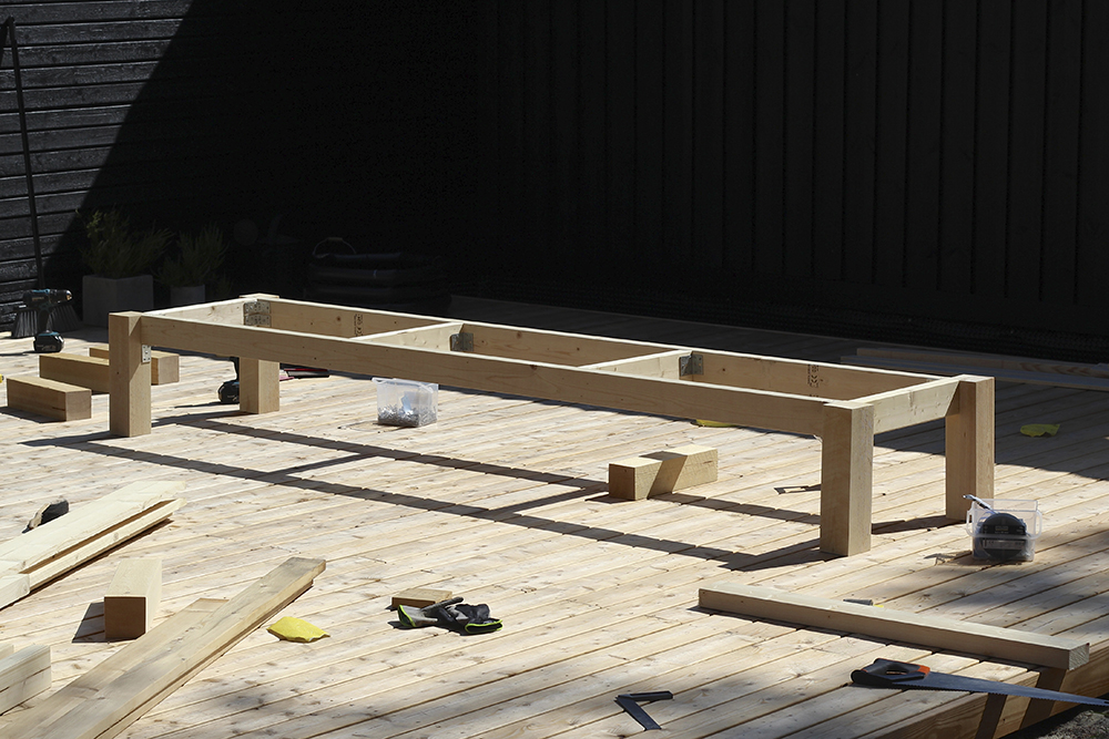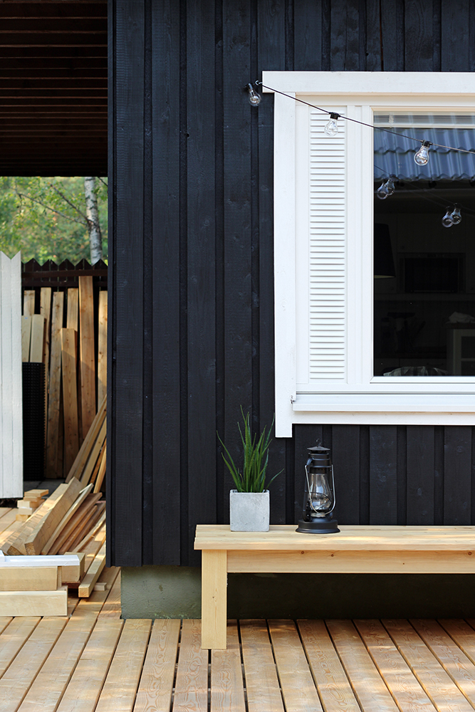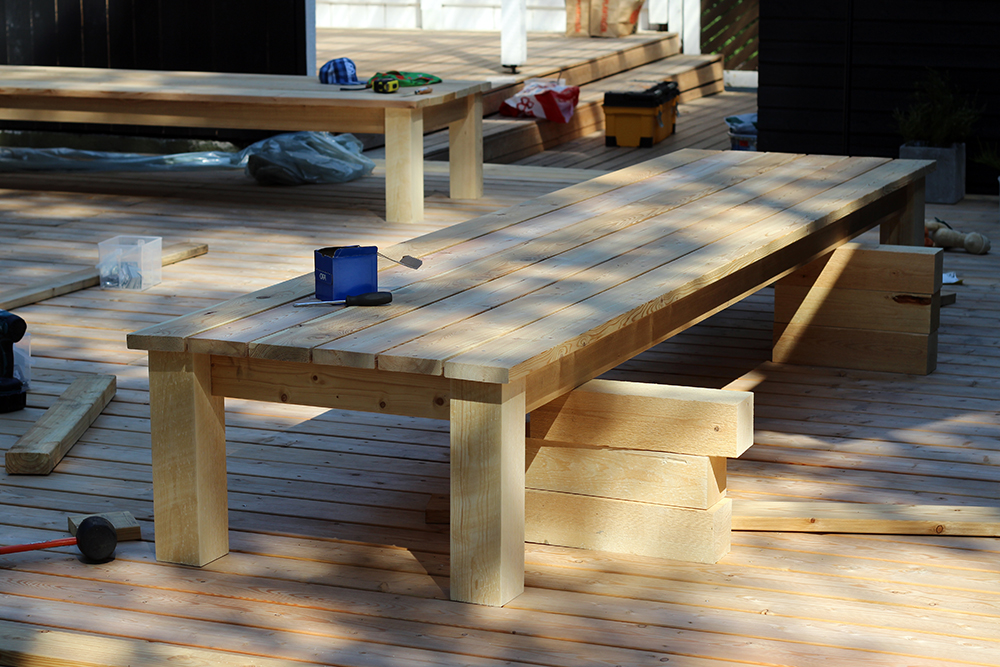 Terassi on sen verran iso, että mahtuu melko massiivisen kokoiset terassikalusteet. Emme ostaneet valmiita kalusteita, vaan päätimme valmistaa kalusteet itse. Isäntä pääsi mukavasti rakentamisen makuun ja pyöräytti sitten kaksi 3,00 x 0,75 m penkkiä. Niihin mahtuu useampi peppu samaan aikaan ja helposti loikoilemaankin. Mietimme penkkien maalausta valkoiseksi, mutta toistaiseksi annetaan olla puunvärisenä ja harmaantua ajan kanssa.