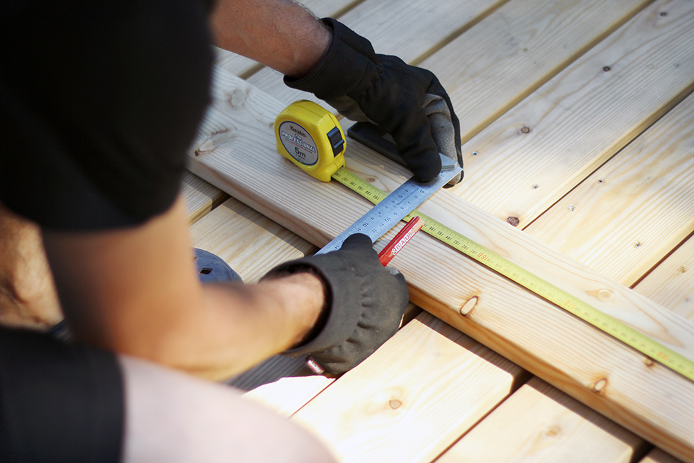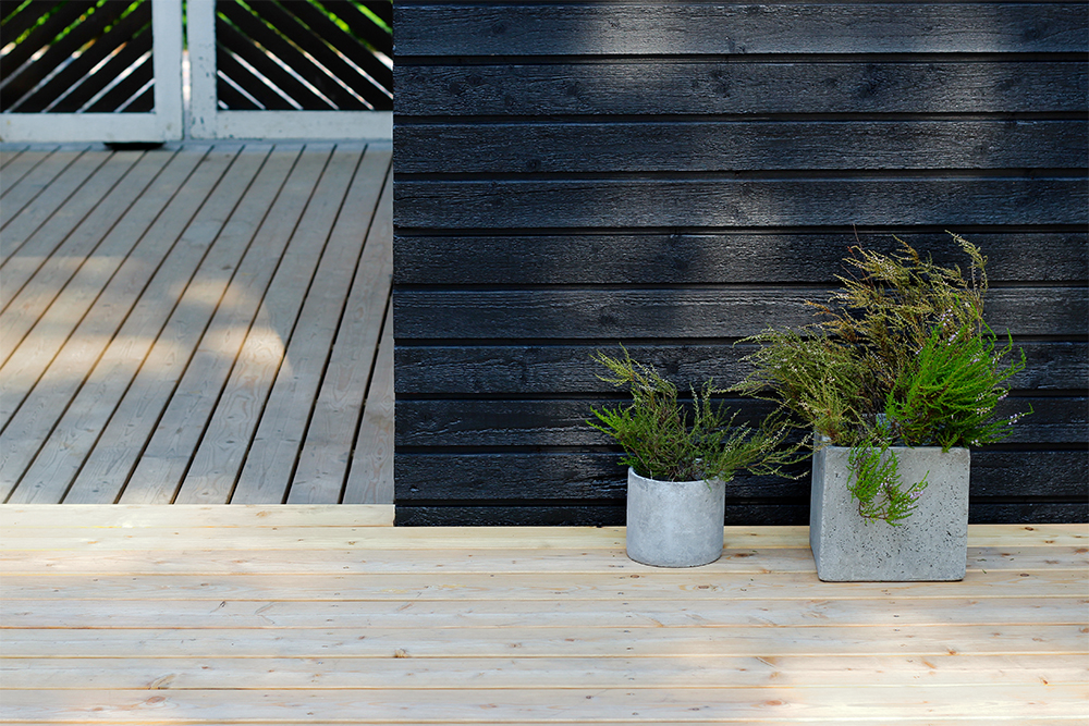 Kuvasta näkyy hyvin, kuinka terassilauta on alkanut jo harmaantumaan. Kivasti näyttäis yhdistyvän katetun terassin kanssa. Reunapuut ja penkki ovat vielä tuoreina alkuperäisessä värissään.