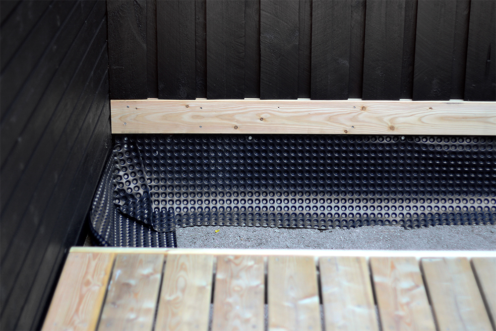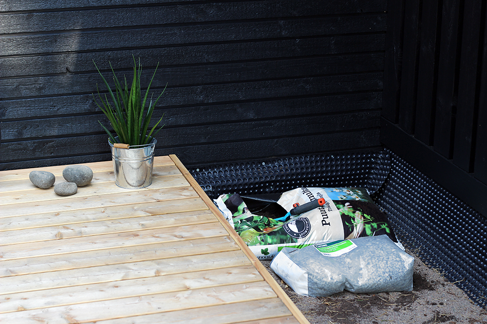 Istutusnurkkaukseen on asennettu jo patolevy. Ruma alaosa meni viimein umpeen! Pitää vielä tilata useampi kuutio multaa, käydä ostamassa runkotuijat sekä spottivalot.