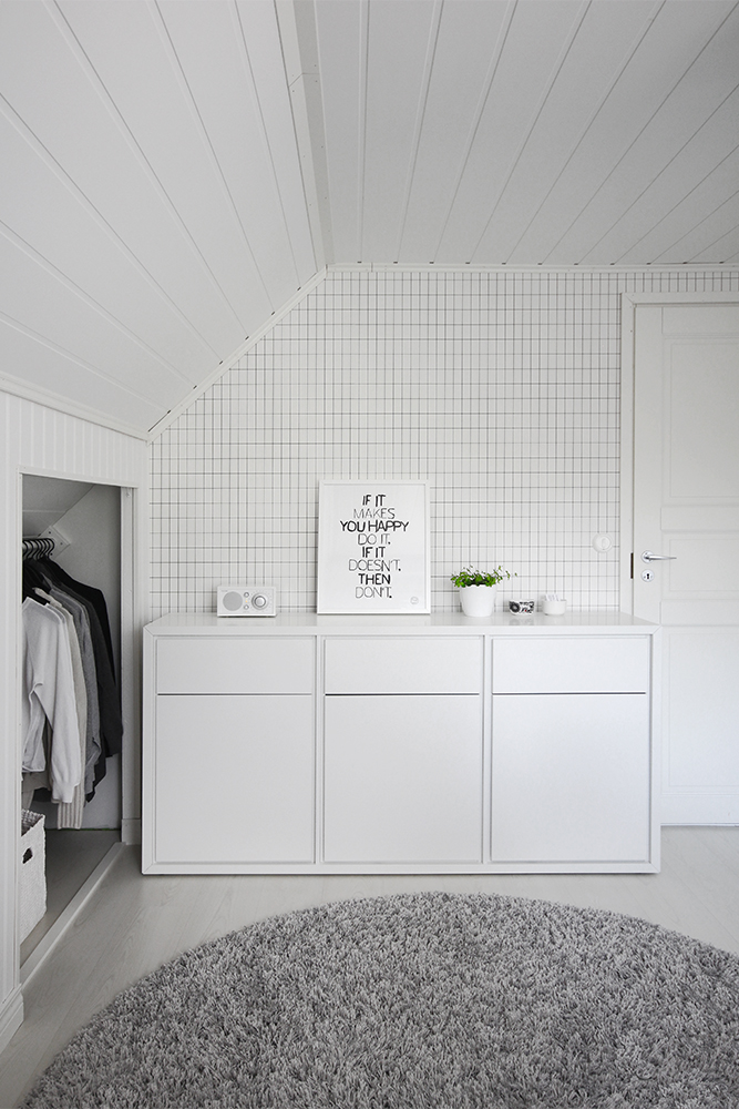 Tapetiksi valikoitui Ferm Living -malliston Grid, joka kolahti heti kun sen näin. Jonkin sortin simppeli ruutukuvio oli tuolloin etsinnässä ja eipä ole yhtään yllättävää, että Ferm Livingin valikoimasta löytyi taas se paras vaihtoehto.