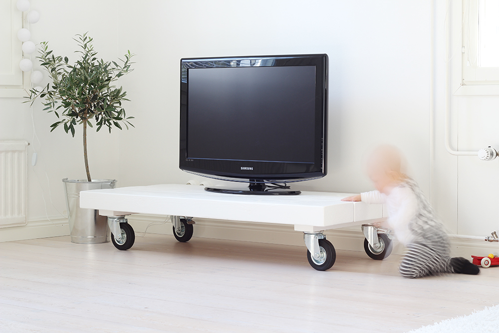 Nuka tykästyi uuteen tv-tasoon. Se nousee koko ajan sen päälle hengailee. Ylettyy nyt painamaan telkkarin päälle, vaihtamaan kanavia ja säätämään volumea ilman kakea. Tiedän, taitava lapsi.