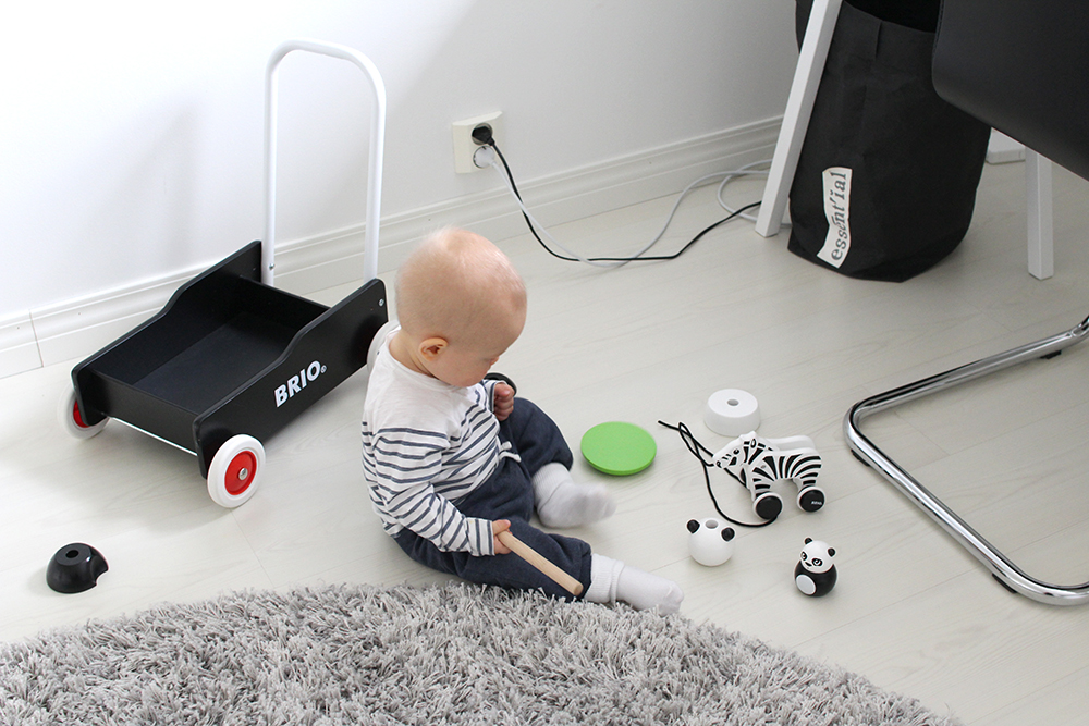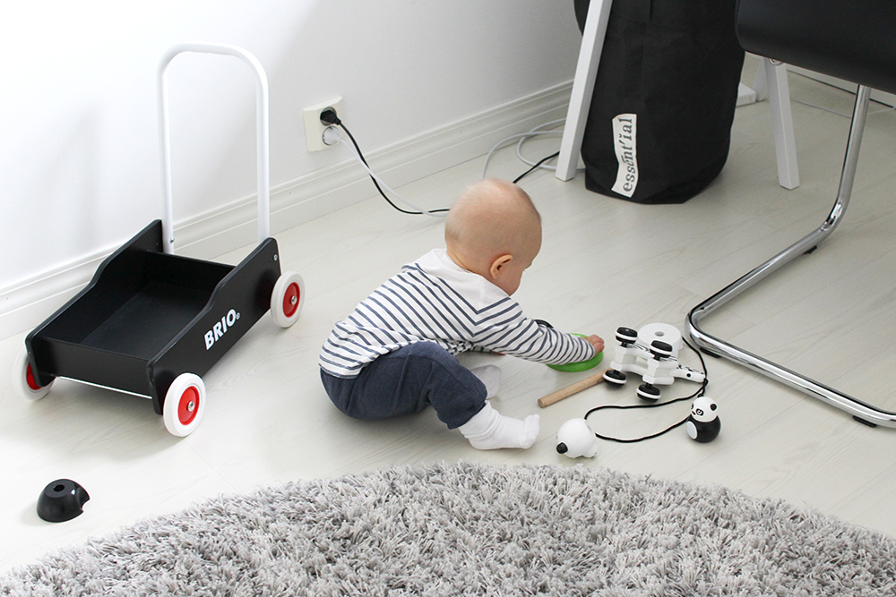 Nuka leikkii onneksi jo hyvin omatoimisesti. Äidin tai isin lahkeessa roikkuminen on tyypillistä, eikä välillä suostuta lähtemään sylistä hetkeksikään pois. Silloin ollaan luovasti multitalentteja.