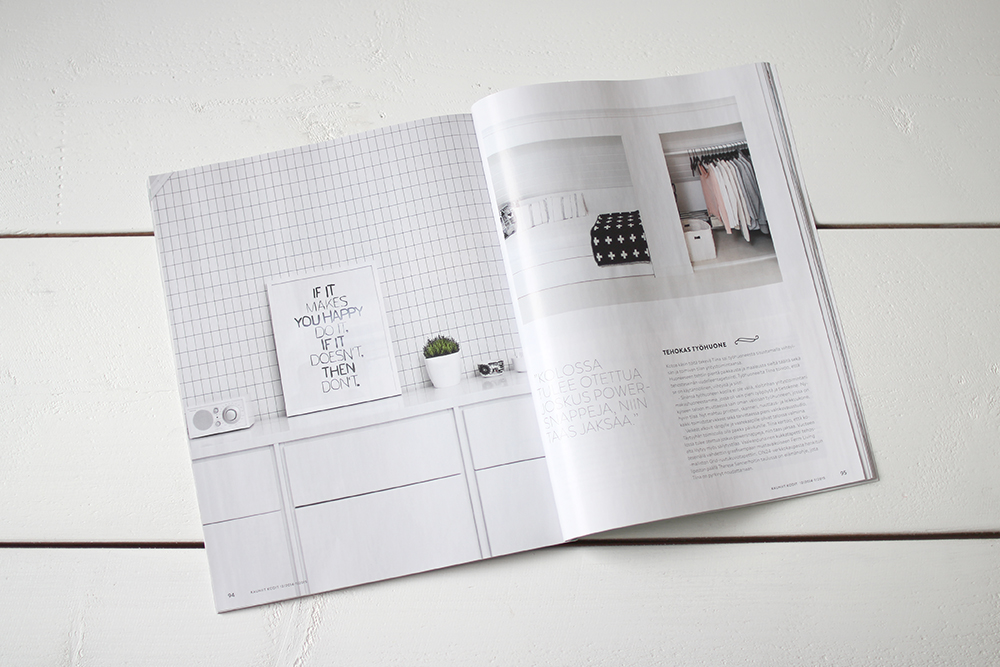 Eilen kauppoihin tuli uusi vuodenvaihdenumero 12/2014 – 1/2015, jossa on myös meidän koti esiteltynä! Jutun on kirjoittanut Marjo Peltoniemi. Kotimme löytyy Lukijan koti -osiossa otsikolla: Graafinen on ajaton.