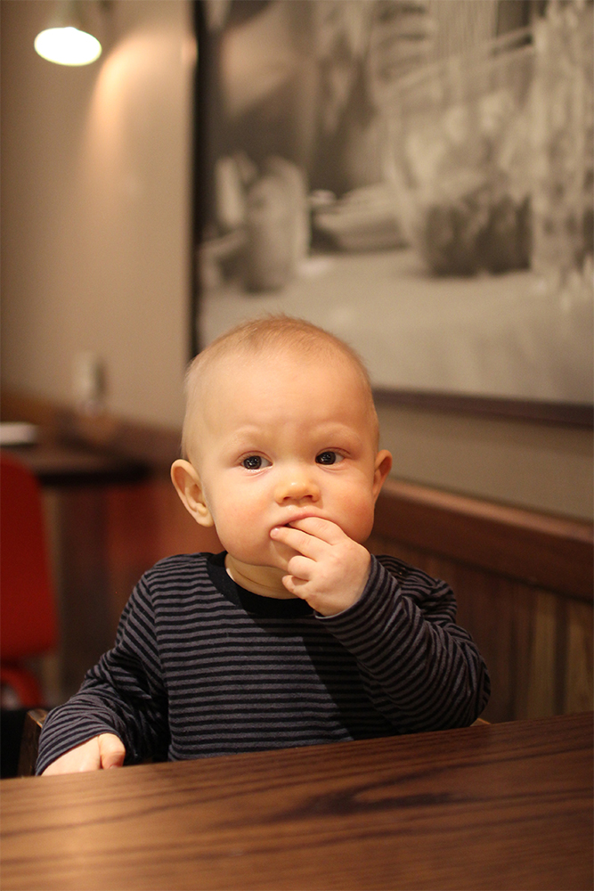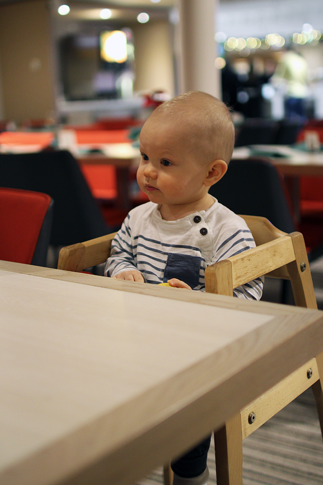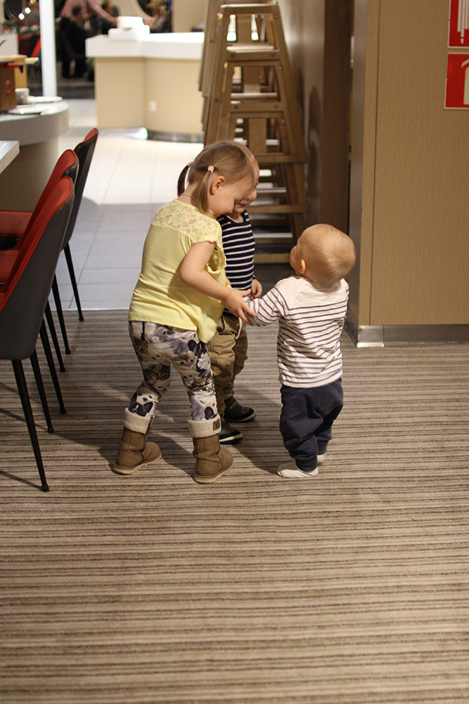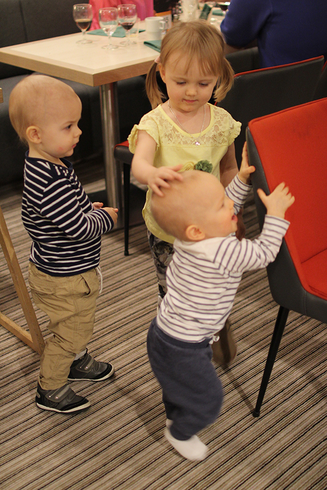 Naapuripöydässä oli kaksi ihanaa lasta, Venla ja Rasmus, jotka naurattivat Nukaa. Hetken vilkuttelun jälkeen uskaltautuivat tekemään lähemmin tuttavuutta, eikä kauaa mennyt kun kaikki kolme painoivat yhdessä käytäviä pitkin. Hauskaa seurattavaa :)