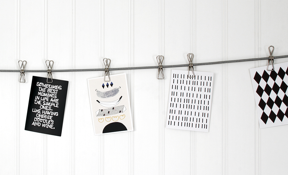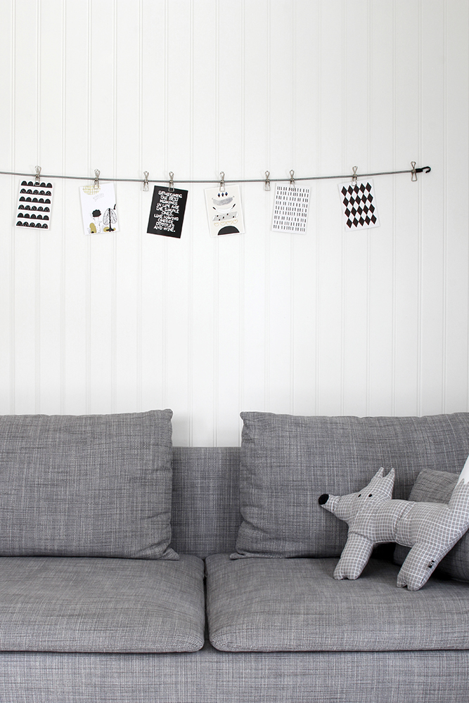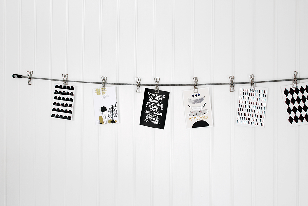 Jos haluaa välttää perinteistä tauluseinää, voi laittaa vaikka tuollaisen rennomman viritelmän. Mikähän tuo nyt on… korttinipsupidikekumiköysipiuha? Jos joku tietää virallisen nimen, saa kertoa! Piuha on hankittu Granitista ja se on laadultaan tosi jämäkkä. Laitoin nipsuihin kiinni erilaisia graafisia kortteja. Olen tykännyt tosi paljon tästä piuhaviritelmästä, enkä ole malttanut vaihdella kortteja tai edes niiden paikkaa kertaakaan.