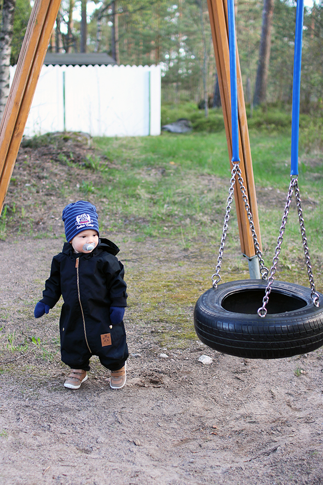 Meidän taloyhtiössa ja itseasiassa meidän takapihalla on lastenleikkipaikka. Siellä on keinut, hiekkalaatikko, liukumäki ja kiipeilyseinä. Sinne Nuka haluaa aina ekana. Ihan hauska, että omalla piha-alueella on puuhasteltavaa. Aluetta ympäröi metsä, vaikka nopeasti pikkuinen on karkaamassa autotielle.