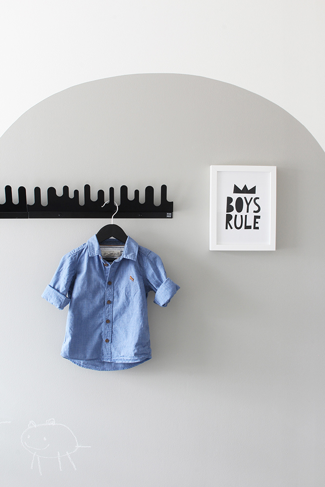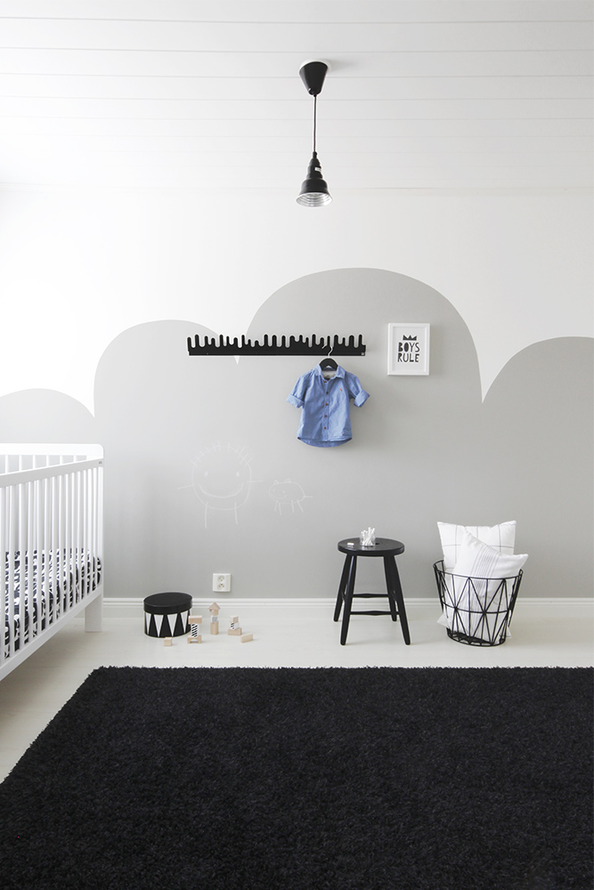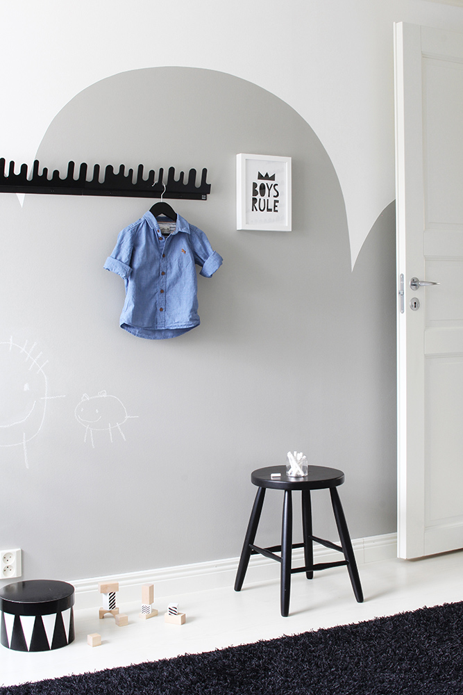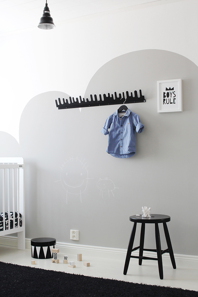 Lastenhuoneen iso valkoinen seinä kaipasi jotain uutta ja mieleen juolahti maalata siihen iso pilvikuvio liitutaulumaalista. Samaa muotokieltä on myös tapetissa sekä lipastossa, joten uskoin kokonaisuuden toimivan hyvin yhdessä.