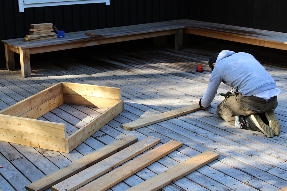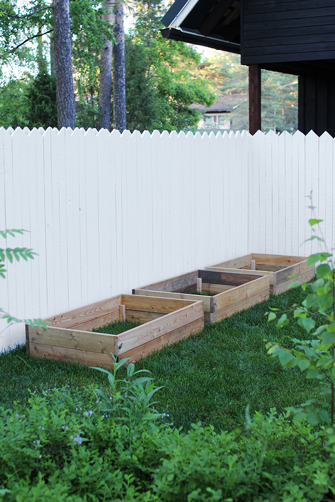 Juhannuspäivän aamuna satoi, mutta iltapäivällä mukavasti selkeni ja aurinkokin alkoi paistamaan, eli päästiin ulos hommiin! Vuorossa oli istutuslaatikot. Terassilautojen vinkkuroista jämäpuista piti saada aikaiseksi kolme istutuslaatikkoa nurmikon nurkkaukseen.