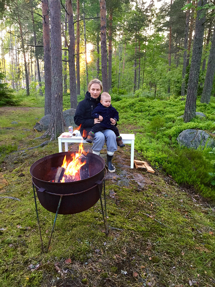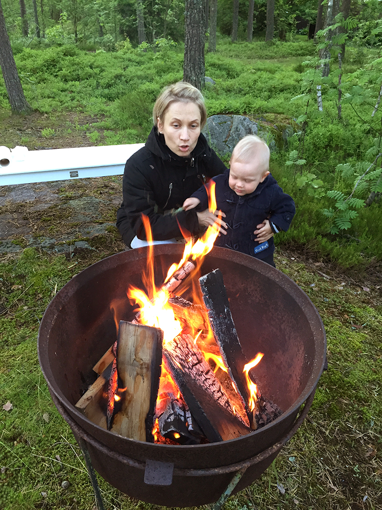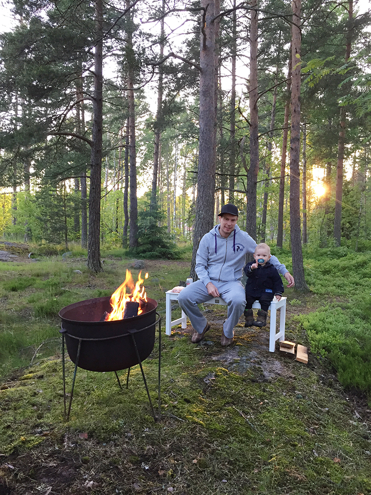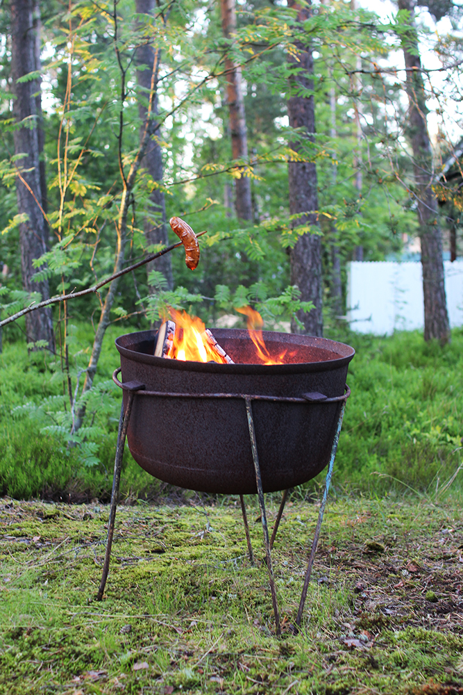 Isännällä oli kova hinku mennä jonnekkin kokkoa katsomaan, mutta päätti tehdä oman notskin takapihalle isoon rautapataan. Siinä me sitten paistettiin makkaraa. Aika kiva tunnelma oli istuskella auringonlaskussa omalla takapihalla, kun maisemat on tuollaiset tosi metsäiset. Ihan kuin mökillä olisi ollut. Tosi leppoisaa. Nopeasti sitä kaupunkilaistytön mieli on muuttunut, kun mäntymetsä ja kalliot niin kovasti ihastuttaa. Vain meri puuttuu.