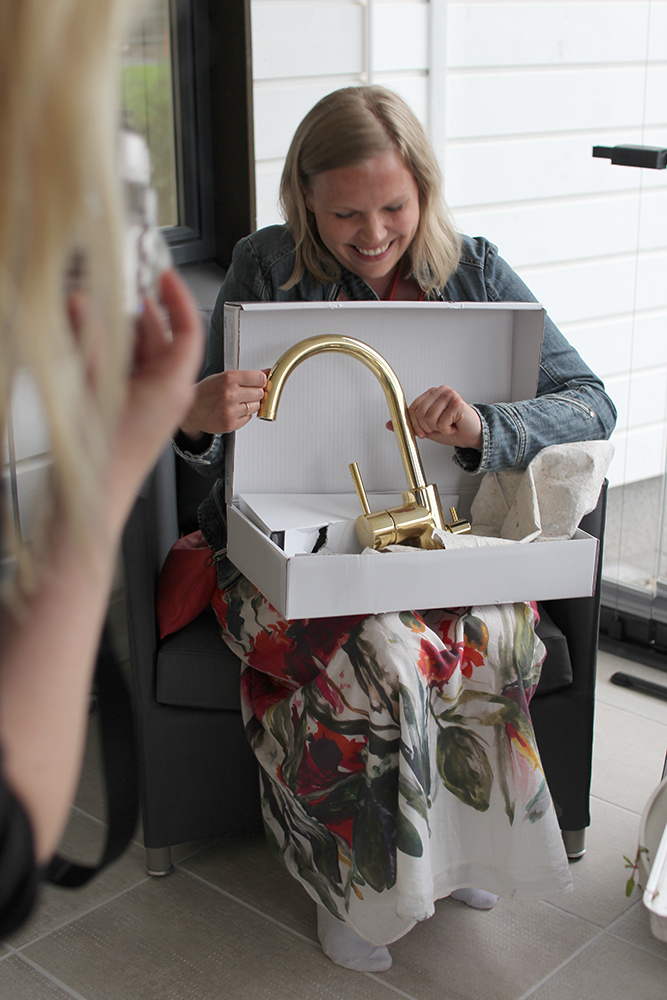 Mintunmustaa-blogin Silja Maarialla oli melkoisen jännittävä hetki, kun Sanna toi tuliaisia. Katsokaas miten komea messinkinen hana löytyi paketista! Wau. Tulee kuulemma mustaan keittiöön ja voin vaan kuvitella miten upea kokonaisuus tulee olemaan vanhan tehdasrakennuksen miljöössä.