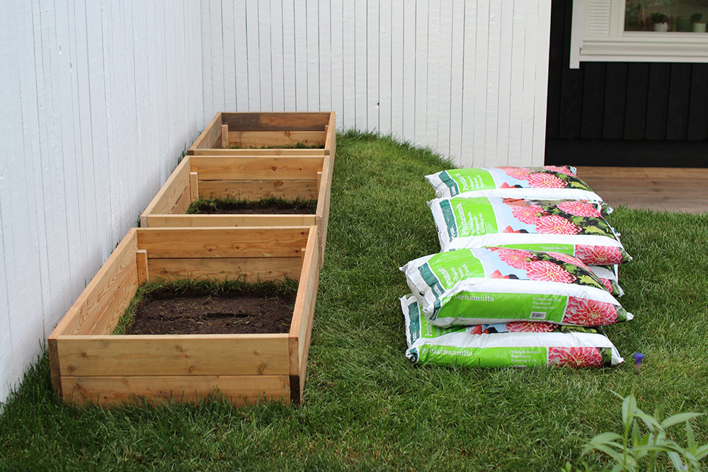 Leikkasin nurmikkoa pois laatikoiden kohdalta ja kiinnitin suodatinkankaat sinkiläpistoolilla. Suodatinkangas pitää rikkakasvit poissa. Plantagenista lähti mukaan 12 säkkiä puutarhamultaa, joka olikin juuri sopiva määrä. Lisäsin vielä mullan sekaan lannoitetta myyjän suosituksesta.