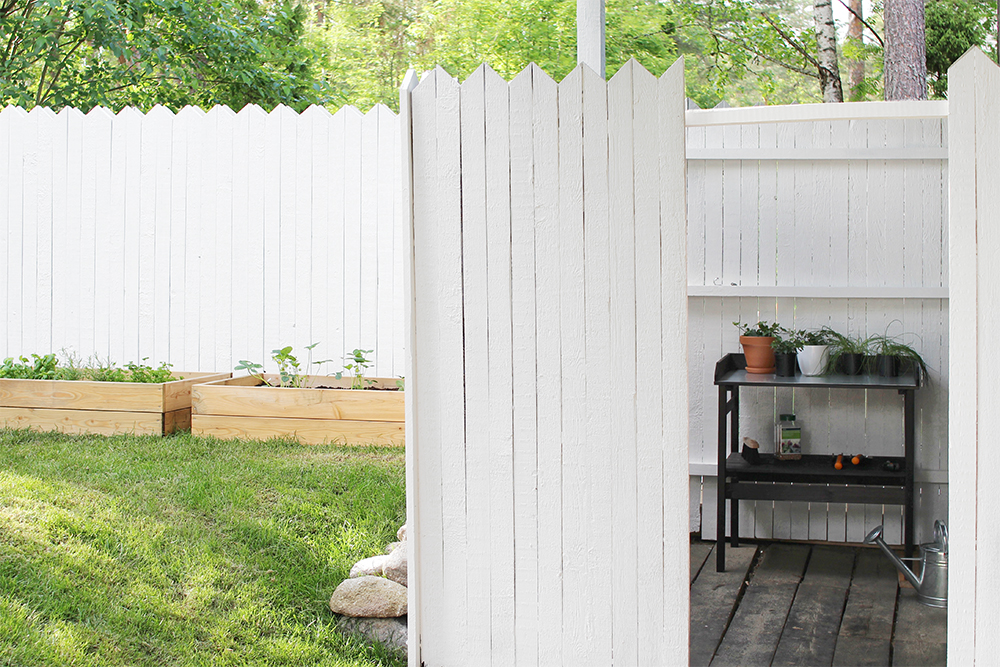Esimerkiksi tämä yllä oleva avovarasto saa nyt aivan uuden elämän! Se oli tosi likainen, pimeä ja täynnä kaikenmaailman tavaraa. Siivosin sen ja maalasin valkoiseksi. Alkoi heti näyttämään ihan erilaiselta ja sitten hokasin, että siitähän tulee istutusnurkkaus! Halusin jonnekkin päin pihaa istutuspöydän ja nyt sille löytyi täydellinen paikka istutuslaatikoiden vierestä. Ai että!