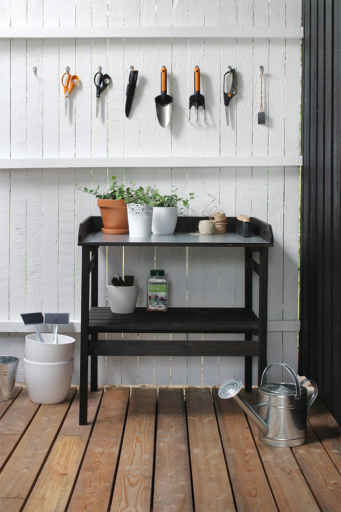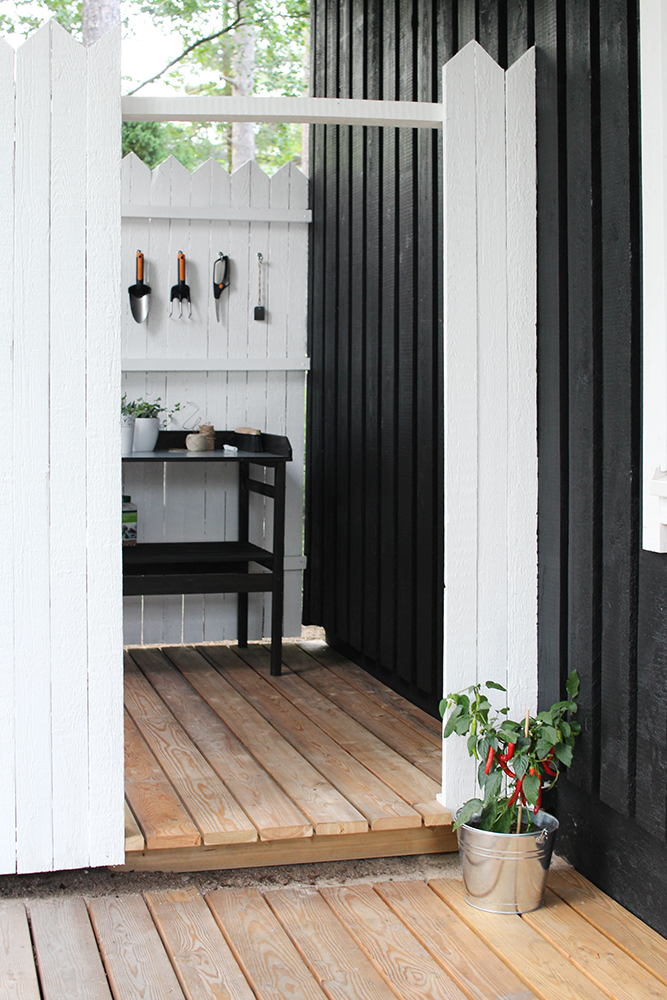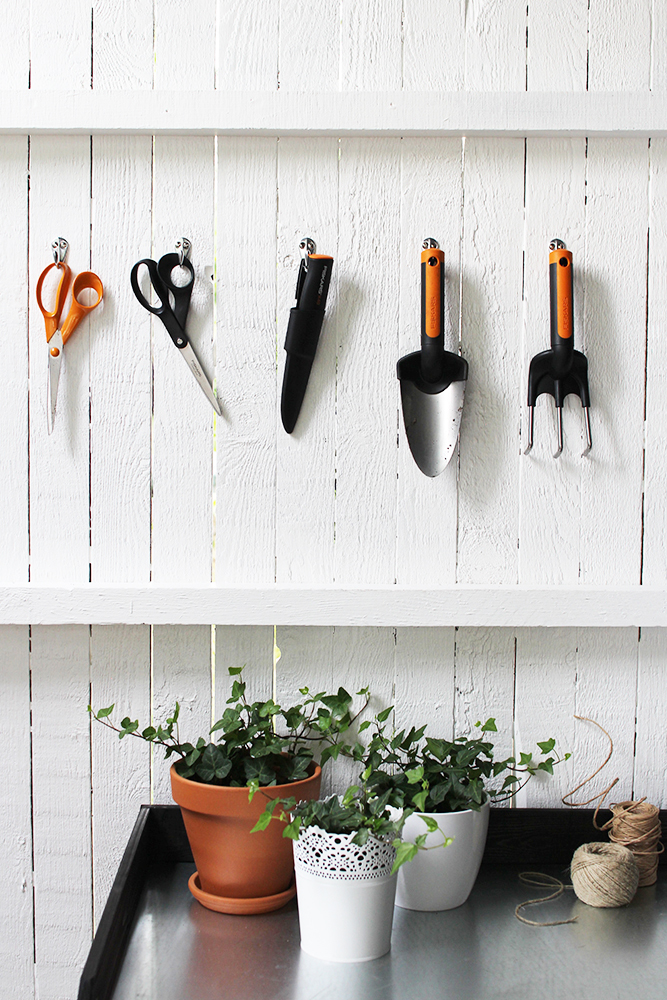 Siivosin varaston rojuista ja maalasin seinät valkoiseksi. Löysin sinne täydellisen istutuspöydän ja seinään laitettiin pienet naulakot puutarhavälineille. Siinä ne pysyy järjestyksessä ja on helposti löydettävissä. Vastaavaa ideaa täytyy käyttää myös meidän isoihin varastoihin, jotta kaikilla työvälineillä on oma paikkansa. Varastot ovat vielä täysin alkuperäisessä kunnossa eli 70-luvulta. Voitte vain kuvitella minkä näköistä!