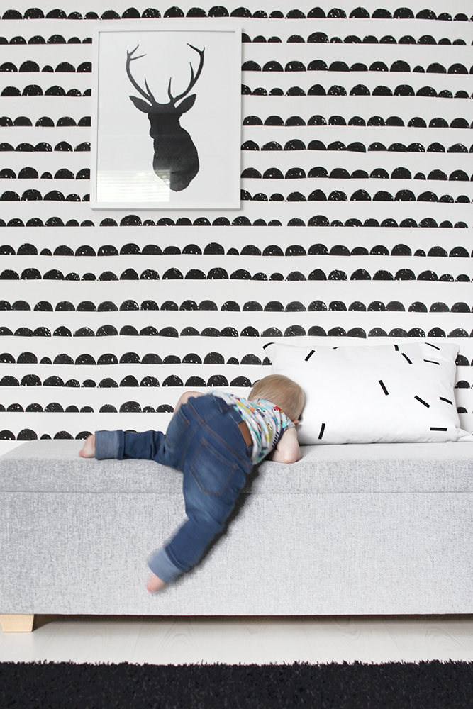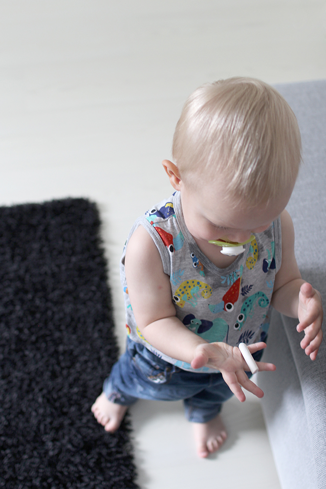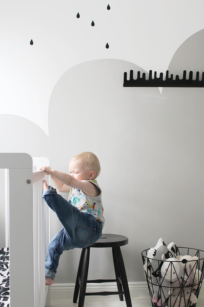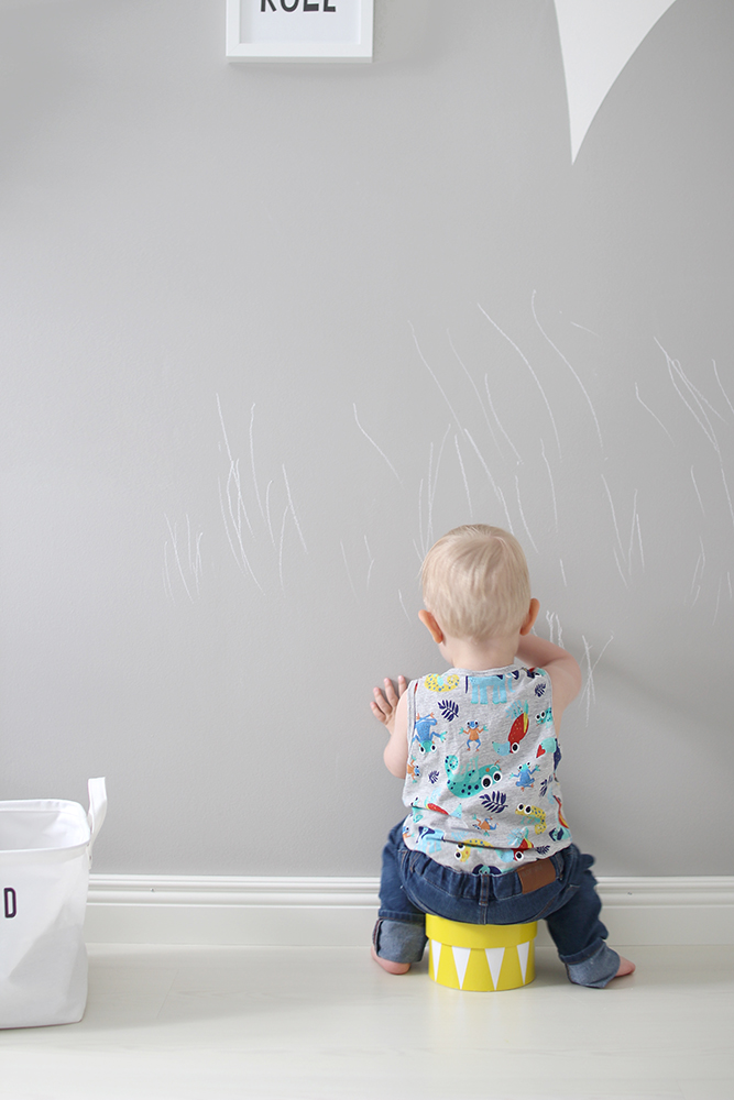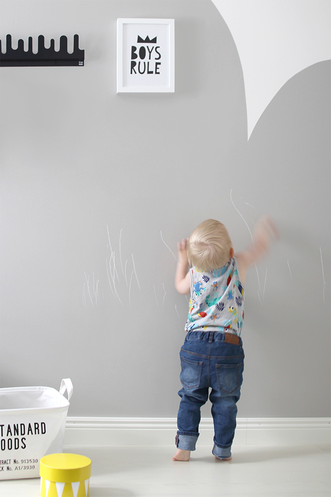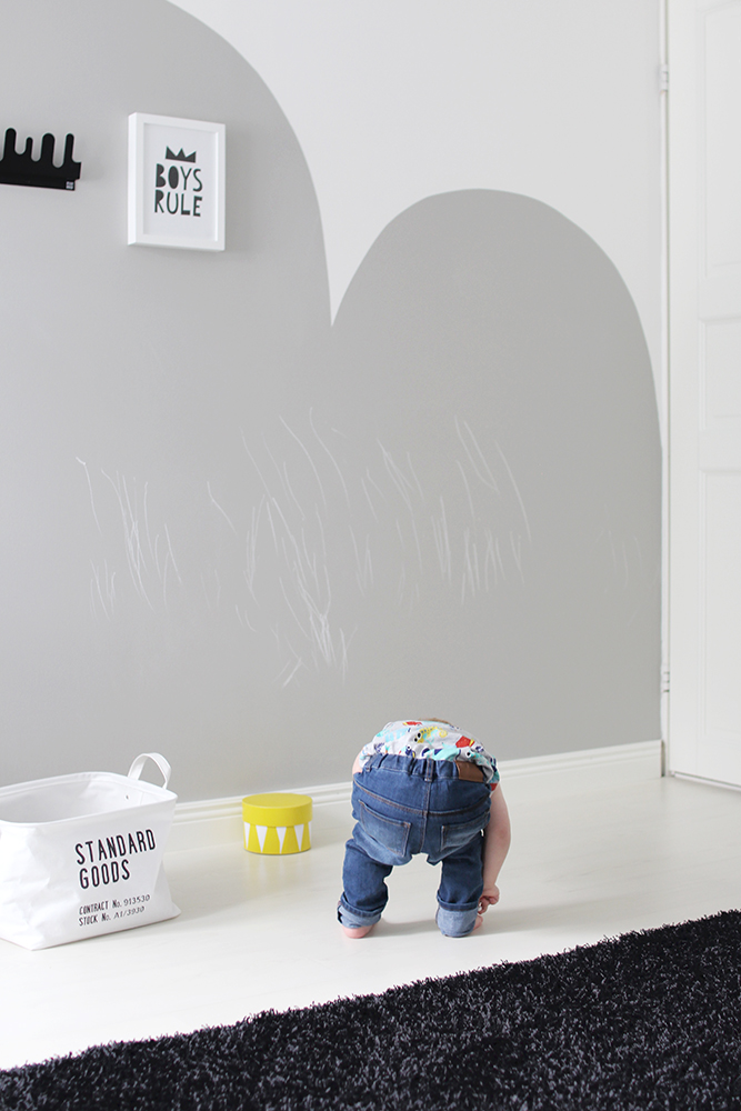 Maalasin lastenhuoneen seinälle ison pilvikuvion sävytettävällä liitutaulumaalilla. Nuka kävi piirtelemässä omia hienoja luomuksiaan seinälle ja sain muutaman kuvan napsittua söpöstä pienestä taiteilijasta.
