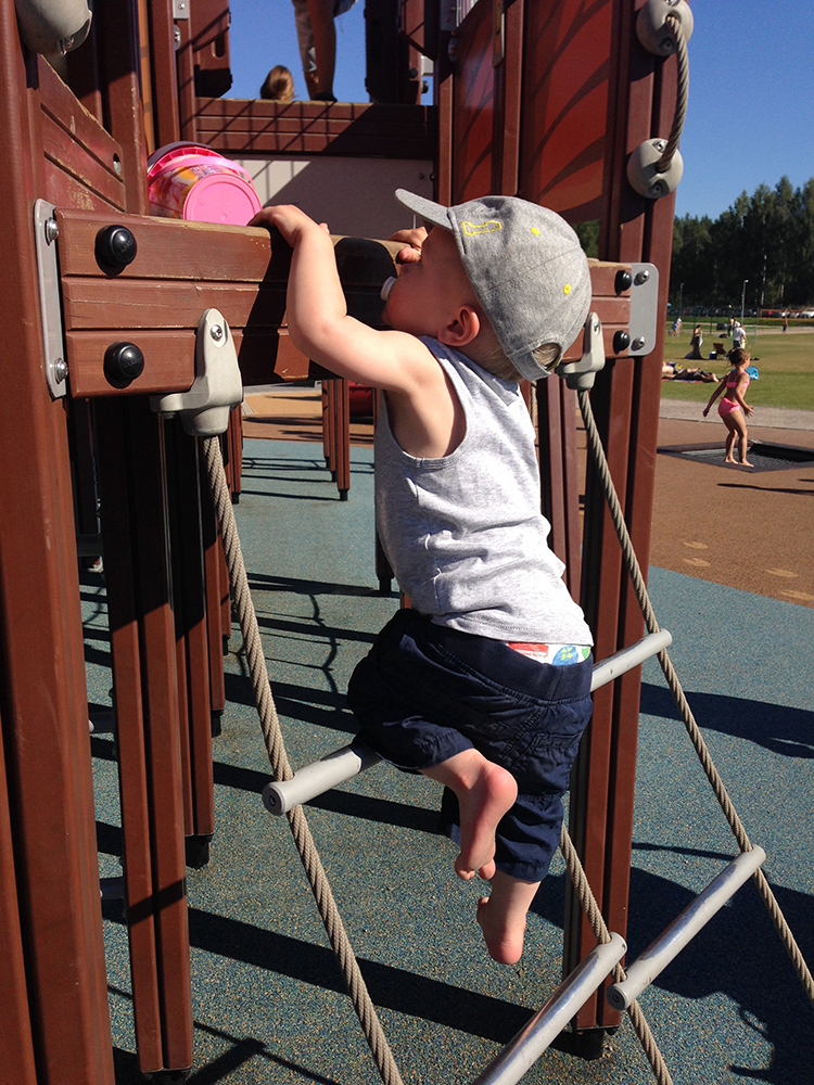 Sunnuntaina sitten vietettiin Nukan kanssa päivä Angry Birds -puistossa Oittaalla, joka on kyllä tosi kiva paikka. Siellä on monipuolisen leikkipuiston lisäksi mm. ravintola ja uimaranta. Pienimies touhusi niin onnellisena ja innokkaana koko päivän, että päiväunet maltettiin ottaa vasta myöhään illalla.