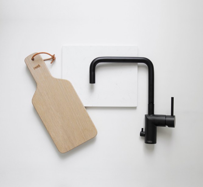 Sisustuksessa tykkään siis pelkistetyn linjakkaasta skandinaavisesta tyylistä. Selkeys, laadukkuus ja kontrastit viehättävät itseäni vuodesta toiseen ja aidot materiaalit pitävät sitkeästi pintansa, kuten puu, betoni, kivi, pellava, villa ja teräs, joita uudessa kodissa haluan erityisesti tuoda nyt mukaan. Kerkesin tehdä muutamia materiaalivalintoja keittiöön ja nyt sinne tulee hana, josta olen pitkään haaveillut: matta musta Niviton hana. Työtasoksi valikoitui kvartsitaso, jossa on pieni marmorimainen kuviointi. Kvartsi on 90 % luonnonkiveä ja loput sekoitetta, joten se pitäisi olla todella laadukas ja helppo käytössä. Kaappien valkoiset ovet vaihtuvat jossain kohtaa puuoviksi, mutta se ei ole tämän hetken projekti, on kuitenkin sitten taas oma investointinsa.