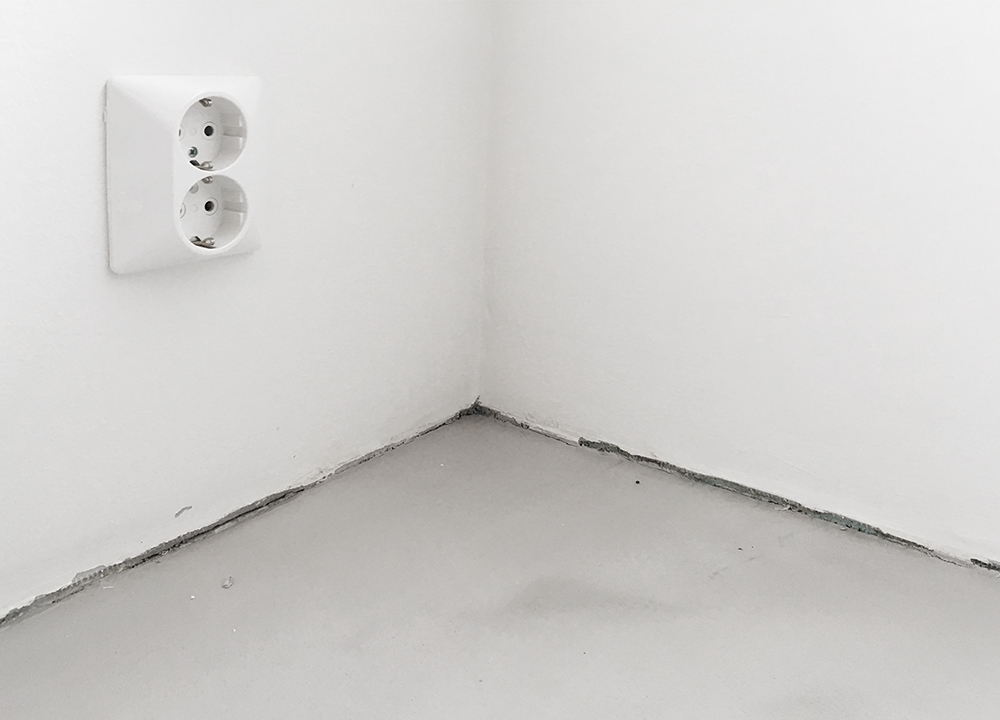 Ja sitten siihen ikävempään yllätykseen. Olin aiemmin tilannut työmiehen tasoittamaan ja maalaamaan seinien sekä lattioiden väliset reunat, koska tavoitteena oli listattomuus. Työ tehtiin ja siistiltä näytti, mutta jotain oli sitten käynyt lattian teon yhteydessä. Näky oli kieltämättä aika raffi. Selvisi, että hiomakoneella oli vetäisty kaikki tasoitetut ja maalatut seinäpinnat uudelleen auki vähän niinkuin vahingossa. Eli se tasoitustyö mistä maksettiin listattomuuden takia, oli täysin turhaa. Nyt oltiin taas samassa tilanteessa.