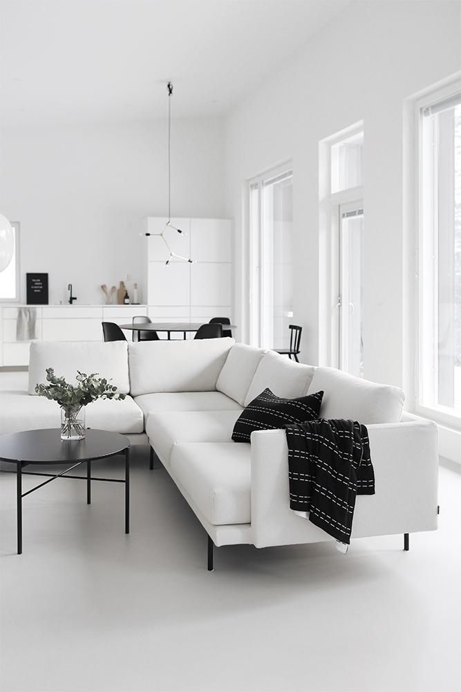Valitsin mallistosta mieleiseni tuotteet, höyhentäytteisen Polku-tyynyn sekä samaa sarjaa olevan kaksipuoleisen Polku-peitteen. Molemmat tuotteet ovat laadukasta 100 % villaa, jotka pysyvät aina käyttövalmiina, kun eivät rypisty. Mustavalkoinen väritys oli varma valinta ja sopii meille ihan täydellisesti. Aion ostaa samanlaisia tyynyjä lisää, yhden tai kaksi, ja ehkä jopa samalla kuosilla, tykästyin tuohon ajattoman graafiseen ilmeeseen niin paljon.