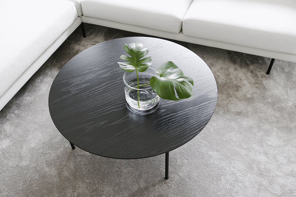Pöytä oli Interfacen Rondo, jota löytyy monessa eri koossa ja materiaalissa. Myymälässä oli muutamia mallikappaleita esillä, joista otin yhden mukaan nähdäkseni miten mittasuhteet toimivat. Kotiin päästyäni varmistuin, että sehän sopi meille just eikä melkein ja tilaukseen lähti mustaksi petsattu saarnipöytä mustilla metallijaloilla. Olin tyytyväinen, että melko vaivattomasti pöytä sitten löytyikin. Tilausajan kerrottiin olevan 5 viikkoa, joka ei edes tuntunut kovinkaan pahalta, olisihan meillä edellinen Hakolan sohvapöytä sen aikaa käytössä.