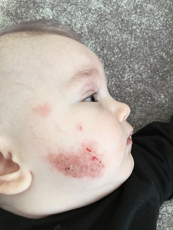 Jo ennen tuota käyntiämme Nilon iho oli jo jonkin aikaa oireillut erikoisesti. Molemmissa poskissa ja siellä täällä vartalossa oli pahannäköistä ihottumaa, jota hän usein hieroi ihan verille asti. Kävin näyttämässä Niloa lääkärissä useamman kerran ja joka kerta määrättiin vain kortisonia hoidoksi, joka auttoi hetkeksi, muttei poistanut itse ongelmaa. Halusin lähteä selvittämään asiaa paremmin ja varasimme ajan Pikkujätin allergialäärille, joka totesi sen olevan tavallista atooppista ihottumaa. Kerroin hyvin selkeästi, etten halua pientä vauvaa vuorata enää kortisonilla tai millään muullakaan lääkkeellä, mutta niin vain taas saatiin resepti seuraavaan lääkeaineeseen, jota olisi pitänyt levittää Nilon iholle monta kertaa päivässä.
