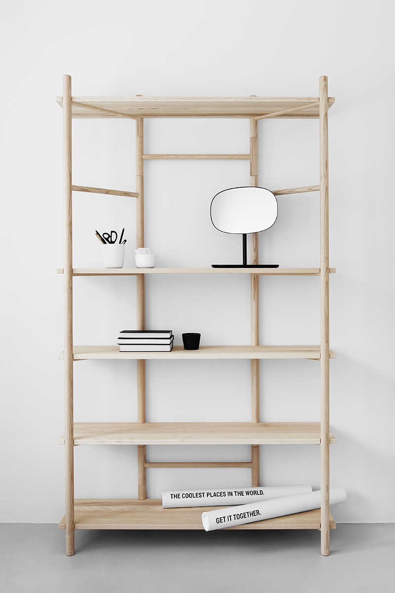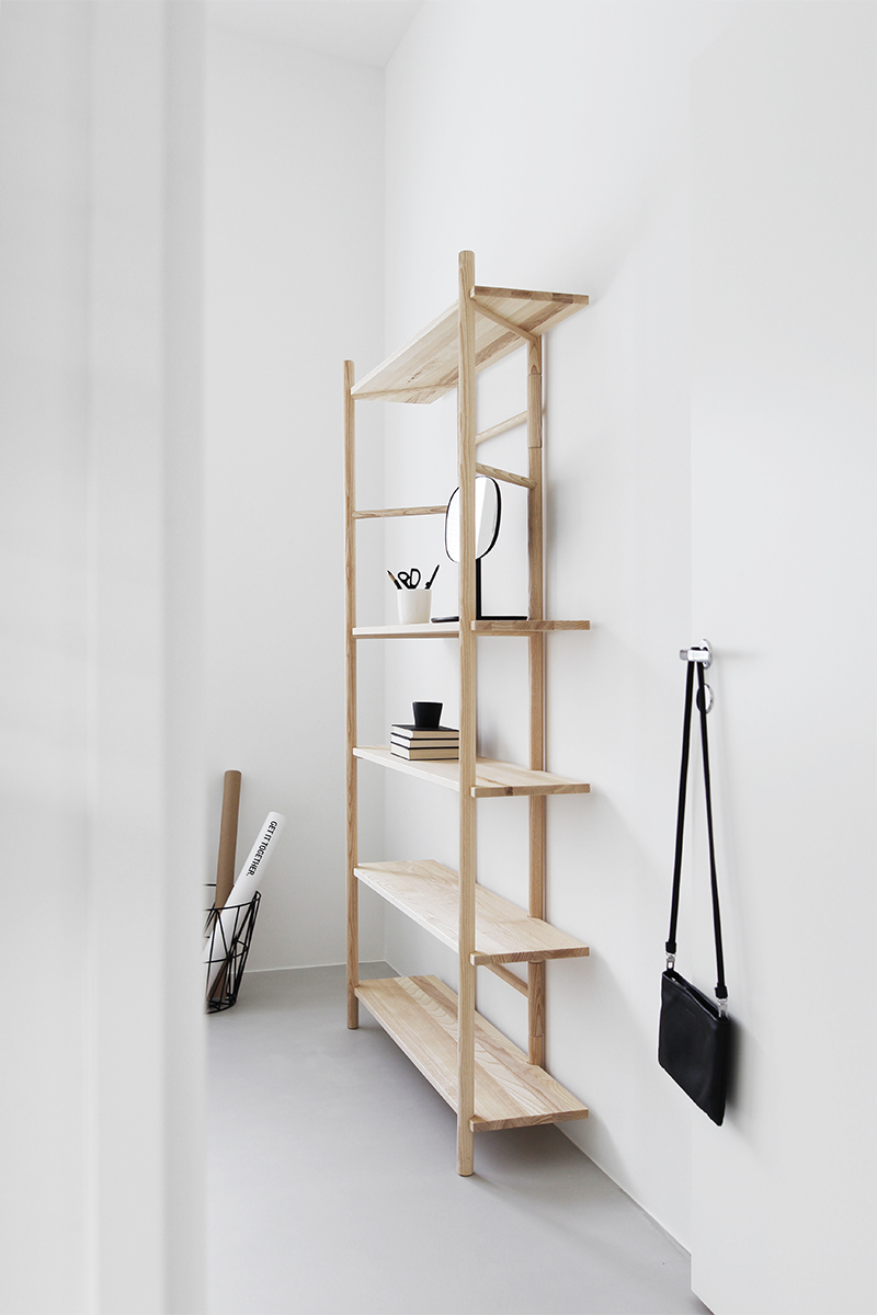 Ainahan se on tosi jännittävää miltä uusi kaluste omassa kodissa näyttää, että toimiiko mittasuhteet, millainen värisävy on ja miten muuten, vastaako yhtään omia visioita. Hyllyn materiaali on saarni, joka on vaaleaa ja hieman kuviollista puuta. Saarnea meillä on entuudestaan sisustuksessa jo pieninä elementteinä, kuten Muuton Dotsit ja Menun Sweeper & Funnel -harjasetti, mutta silti jännitti miltä kyseinen hylly näyttää, onhan se tehty käsityönä ja saarnelle ominaista on puun pintaa kuvioivat vuosilustot, jotka tekevät ilmeestä hyvin eläväisen.