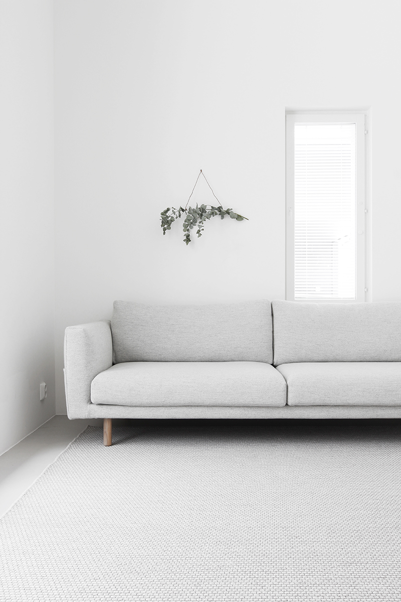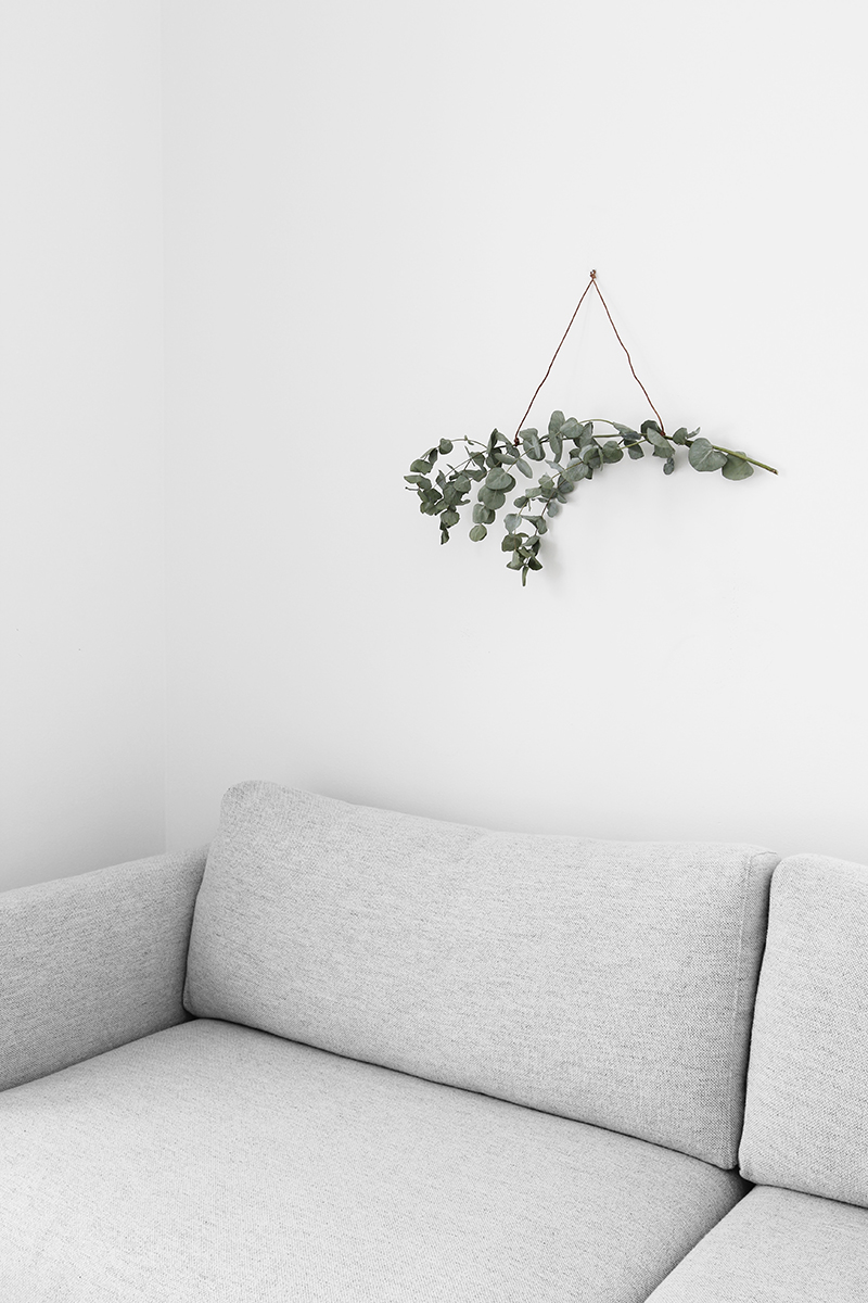 Stailasin nämä kuvat yksinkertaisesti ja hieman pehmeämmin, yleensä kun käytän mustaa tuomaan kontrastia. Väkersin seinälle tuommosen simppelin koristeen eukalyptuksesta, joka oli harmillisesti kuivahtanut yön aikana, kun en tajunnut nakata veteen. Noh, tarkoitus oli toki se kuivattaa, onhan se ihan kaunis noinkin.