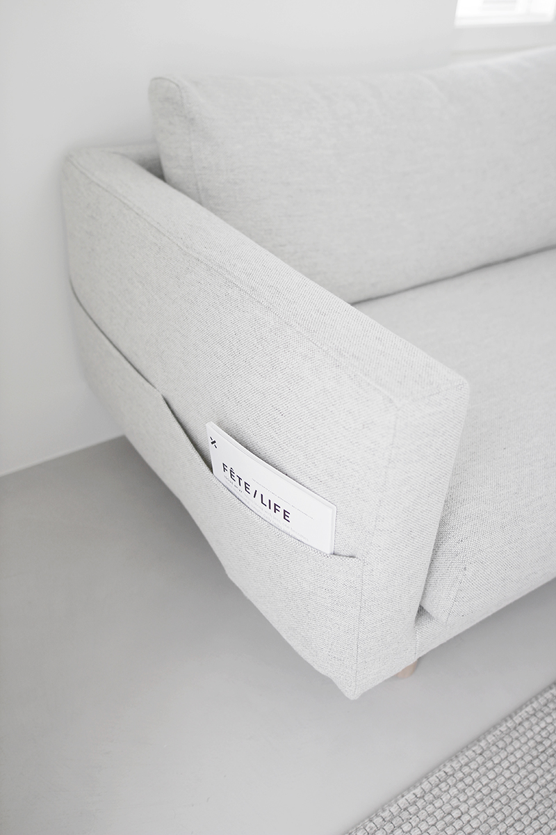 Nimensä mukaisesti sohvasta löytyy tasku! Vasemmassa käsinojassa on kaksi iso taskua lehdille ja kaukosäätimelle, joka tuppaa useinmiten olemaan kadoksissa. Nyt on kakella oma vakkaripaikka – tai siis toinen sellainen, kukkaruukun lisäksi.