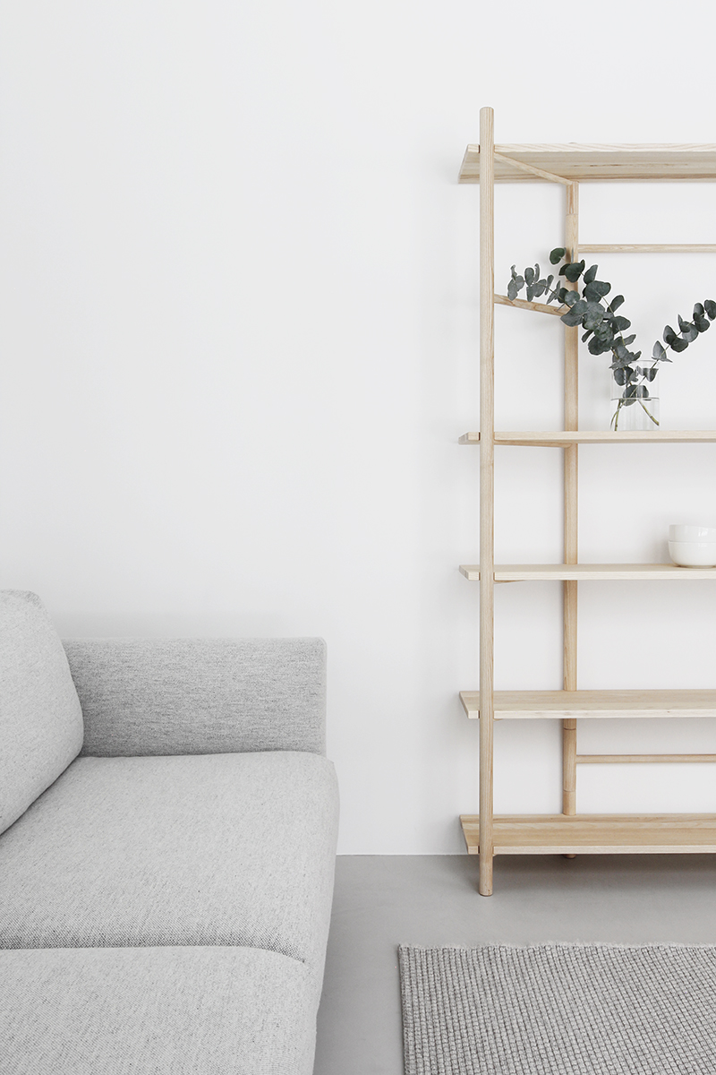 Halusin kokeilla Edit-hyllyä myös telkkarihuoneeseen ja katsoa miltä se siellä näyttää sohvan kanssa. Aika ihana kokonaisuus! Sohvan jalat ovat saarnia, kuten hyllykin, joten sopiihan ne tosi nätisti yhteen ja ylipäätään tuohon tilaan. Hylly on tuossa nyt vain hetken, kunnes siirrän tv-tason telkkareineen takaisin paikoilleen. Voi kun voisi jättää tilan noin kepeäksi! Eipä se telkkari ole sisustuselementtinä mikään kaunein, mutta joo, meillä sitä katsotaan toisinaan hyvinkin paljon ja eikös telkkarihuoneessa kuuluu olla telkkari, hah.
