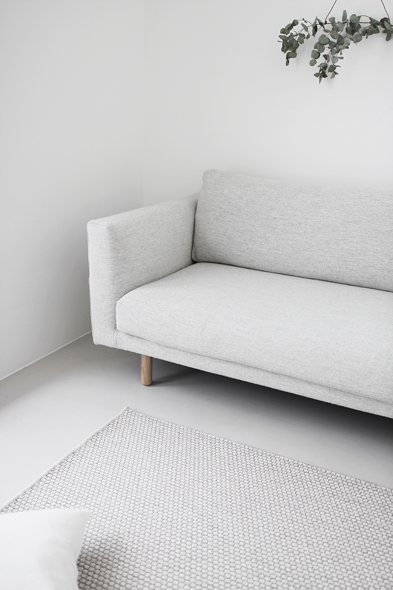Sohva on verhoiltu meleeratun harmaalla Kvadratin Hallingdal 65 -villakankaalla, jonka värisävy on kauniin pehmeä. Päälliselle suositellaan kuivapesua, mutta koska villakangas tunnetusti hylkii likaa, sopii se kuitenkin lapsiperheistä julkitiloihin vallan mainiosti. Onhan tuo meidän villamattokin saanut useamman kerran pastabolognesea ylleen, mutta niin vain matto puhdisti itse itsensä, kun ensin pyyhkäisi kunnolla kostealla pahimmat pois. Villa on yllättävän helppo ja huoleton materiaali.