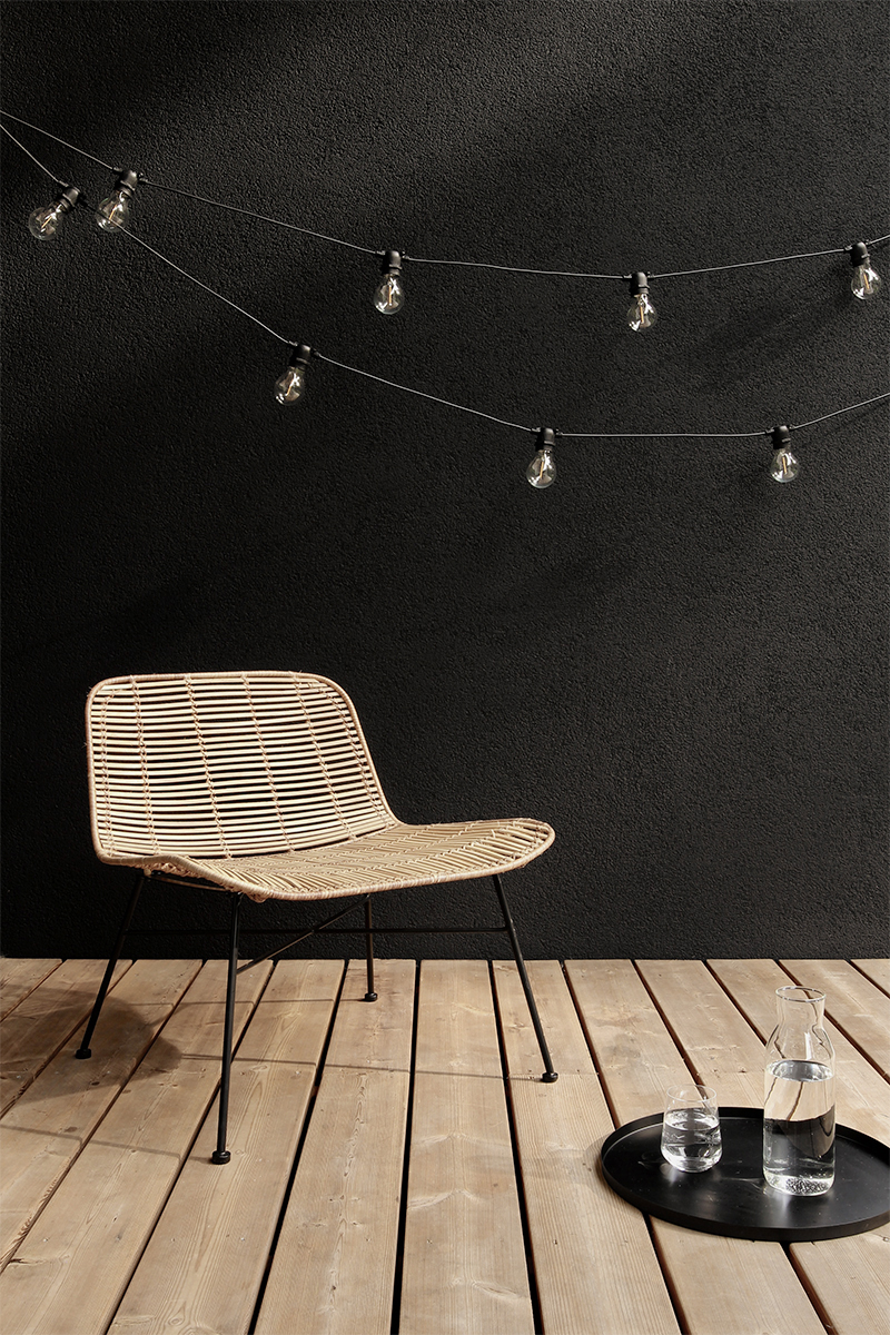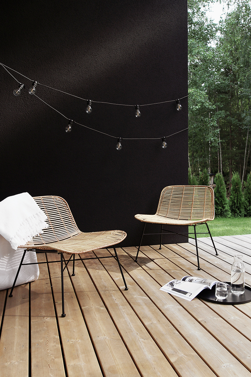 Rottinki on sopinut terassillemme parhaiten ja materiaalina se on myös mieleisin. Pohdin erilaisia penkkejä, tuoleja sekä jakkaroita, ja jossain vaiheessa silmiini osui Veken puutarhakalusteiden valikoimista Bloomingvillen Dom -rottinkituolit. Tuolien yksinkertainen muotoilu viehätti ensisilmäyksellä, ne olivat jotenkin tosi söpöt. Luonnonvärinen rottinki yhdistettynä mustaksi maalattuun teräkseen näytti tosi kivalta. Tiesin heti, että nämä ihanat rottinkituolit täydentävät terassimme.
