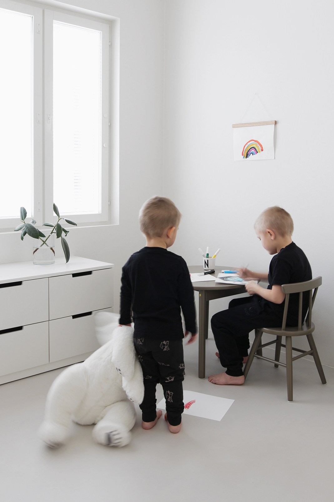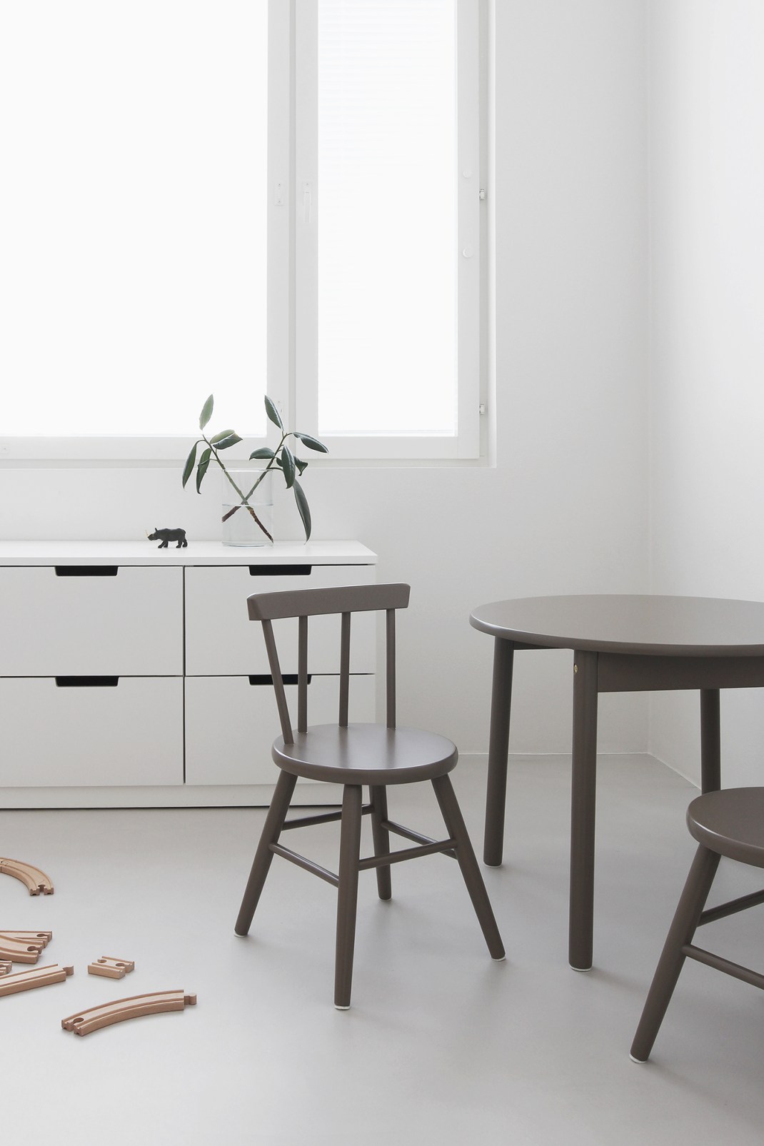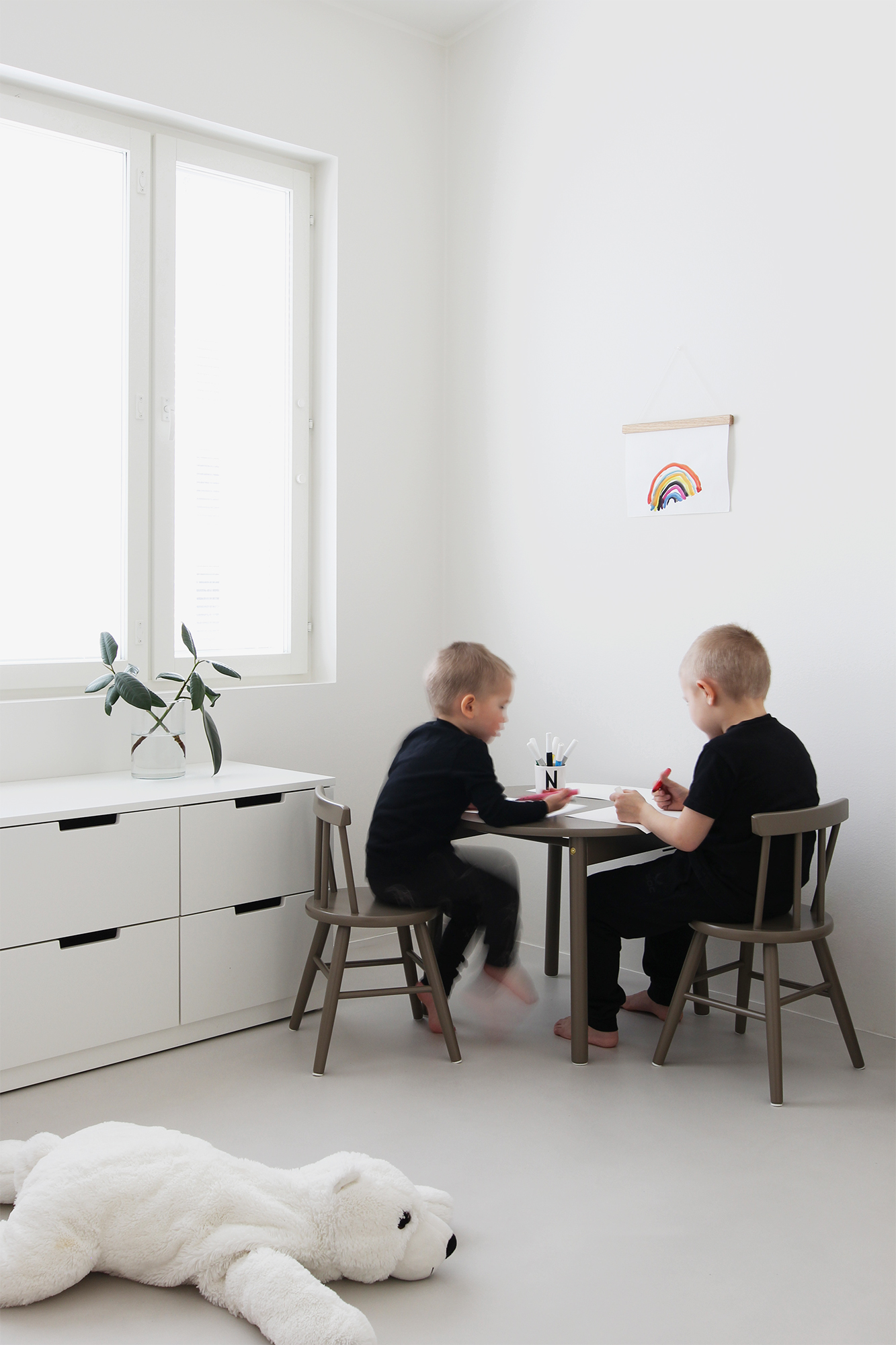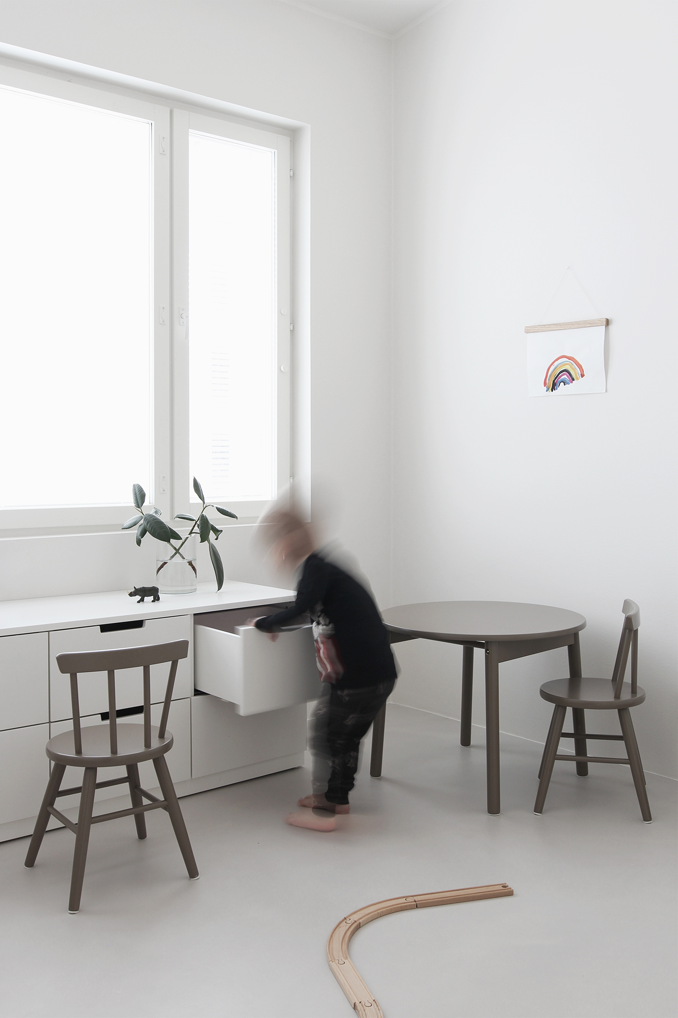 Aika kivasti toi luonnetta sisustukseen tuo väri. Olen tosi tyytyväinen, että valitsin melko tumman sävyn ensimmäisistä suunnitelmista poiketen. Vaikka kyseessä onkin lastenkalusteet, sopii ne neutraalin värinsä ansiosta hienosti mihin tilaan vaan. Eli ei haittaa yhtään, vaikka pyörivätkin ympäri asuntoa.