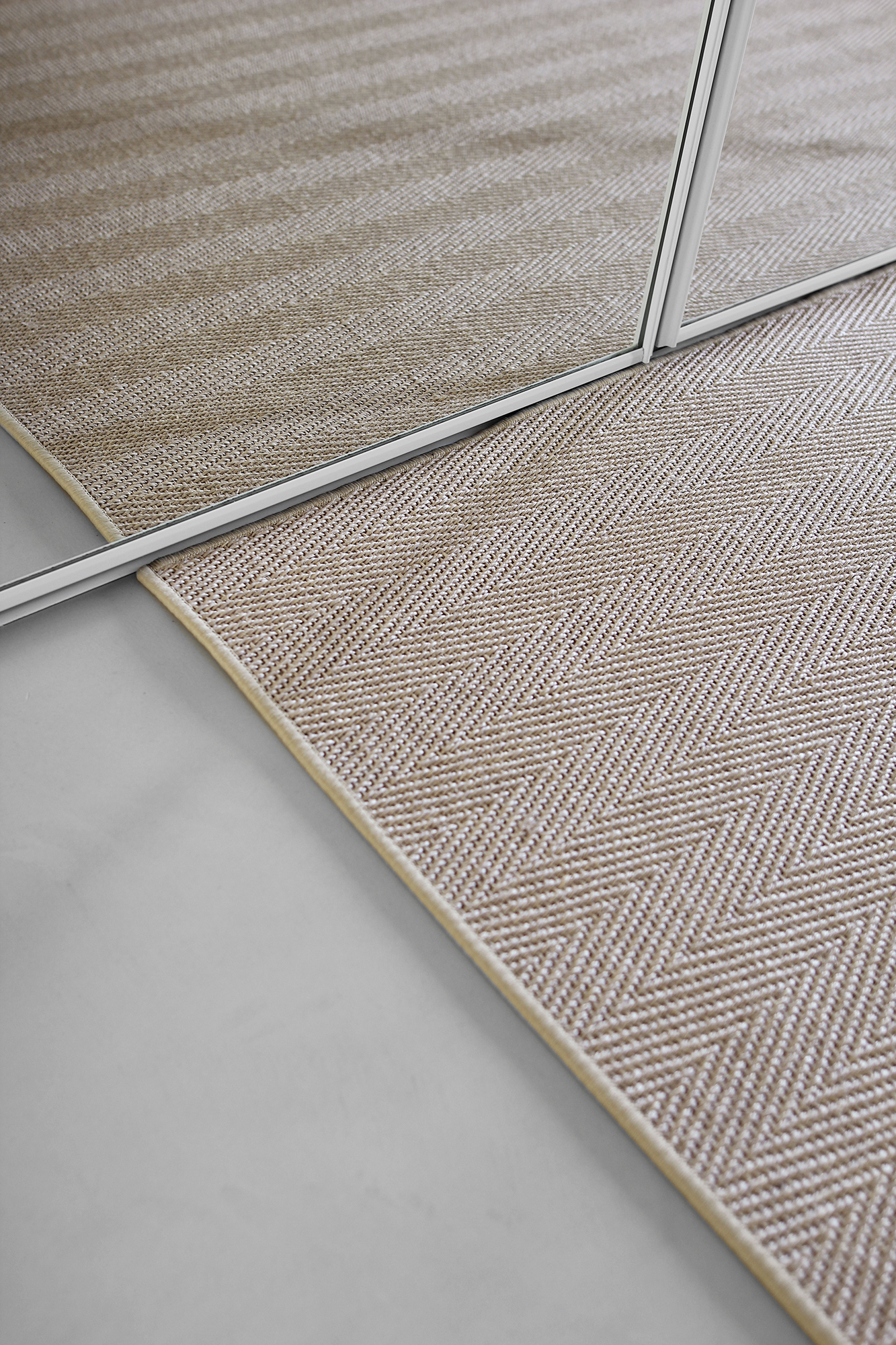 Kun matto saapui, ihailin sen upeaa kalanruotokuviota ja värisävyä. Huomasin kuitenkin heti, että oma visioni maton mitoista oli mennyt oikeastaan täysin pieleen. Se oli kyllä valmistettu antamieni mittojen mukaan, muttei se istunut pitkänmalliseen eteiseen juuri ollenkaan. Matto oli aivan liian lyhyt ja aivan liian leveä. Ajattelin, että se istuu nätisti, kun mitta on peilikaappiin asti, mutta paksuhkon lankakanttauksen seurauksena se takertuikin liian herkästi liukuoviin.