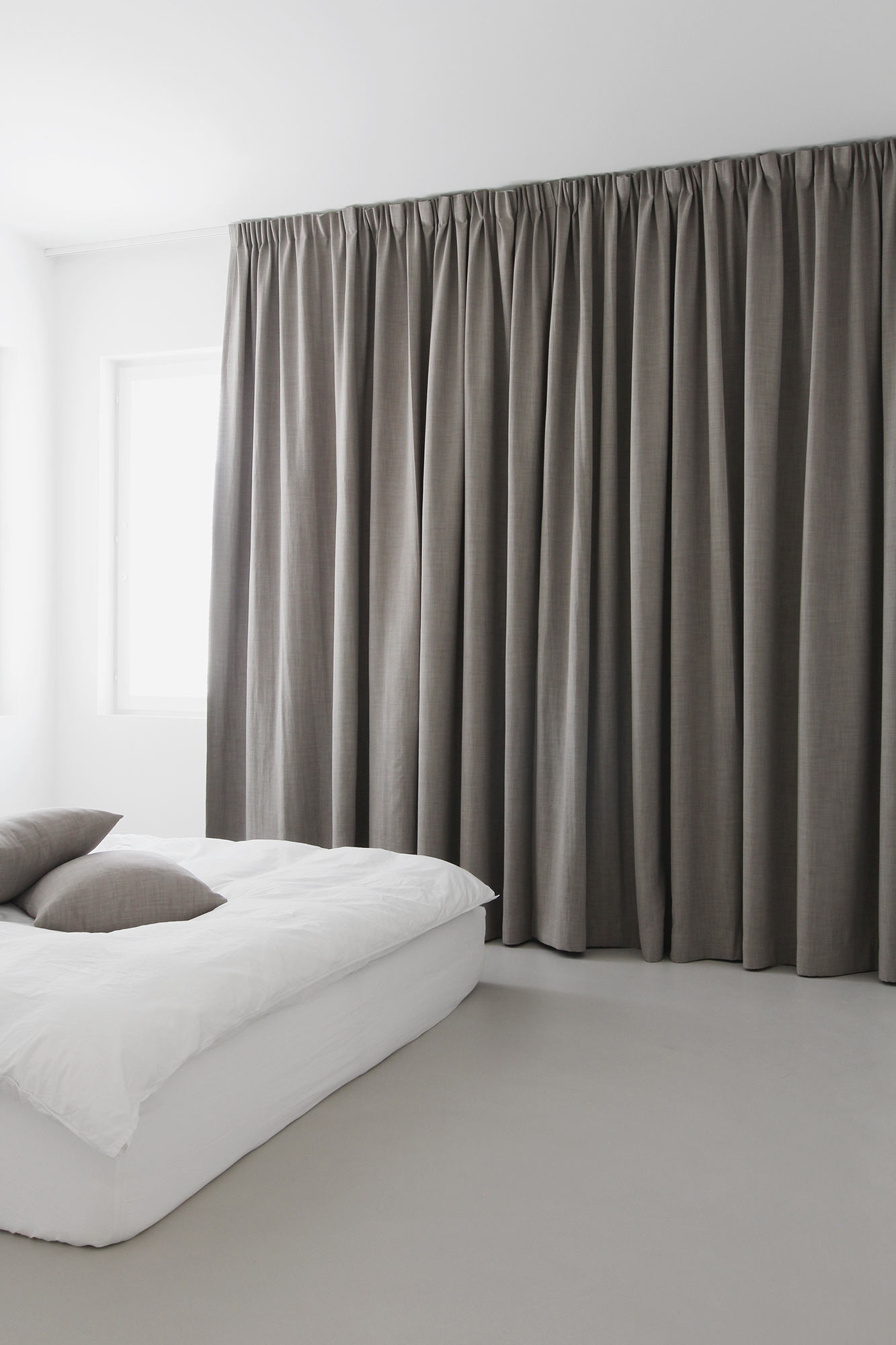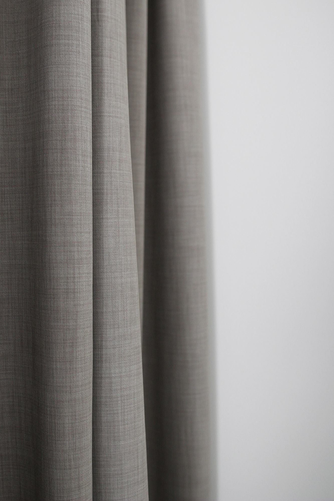 Löysin kauniin vivahteikkaan beigen värisen Rusticae-kankaan*, joka oli sattumoisin vielä tuplaleveää. Kangas on pimentävää ja paloturvallista 100 % polyesteria, eristäen ääntä. Käytin kangasmallin kotona ja se vaikutti juuri sopivalta makuuhuoneeseen. Laitoin verhot tilaukseen.