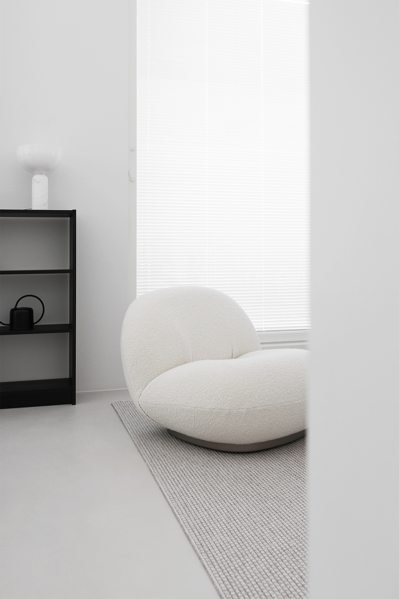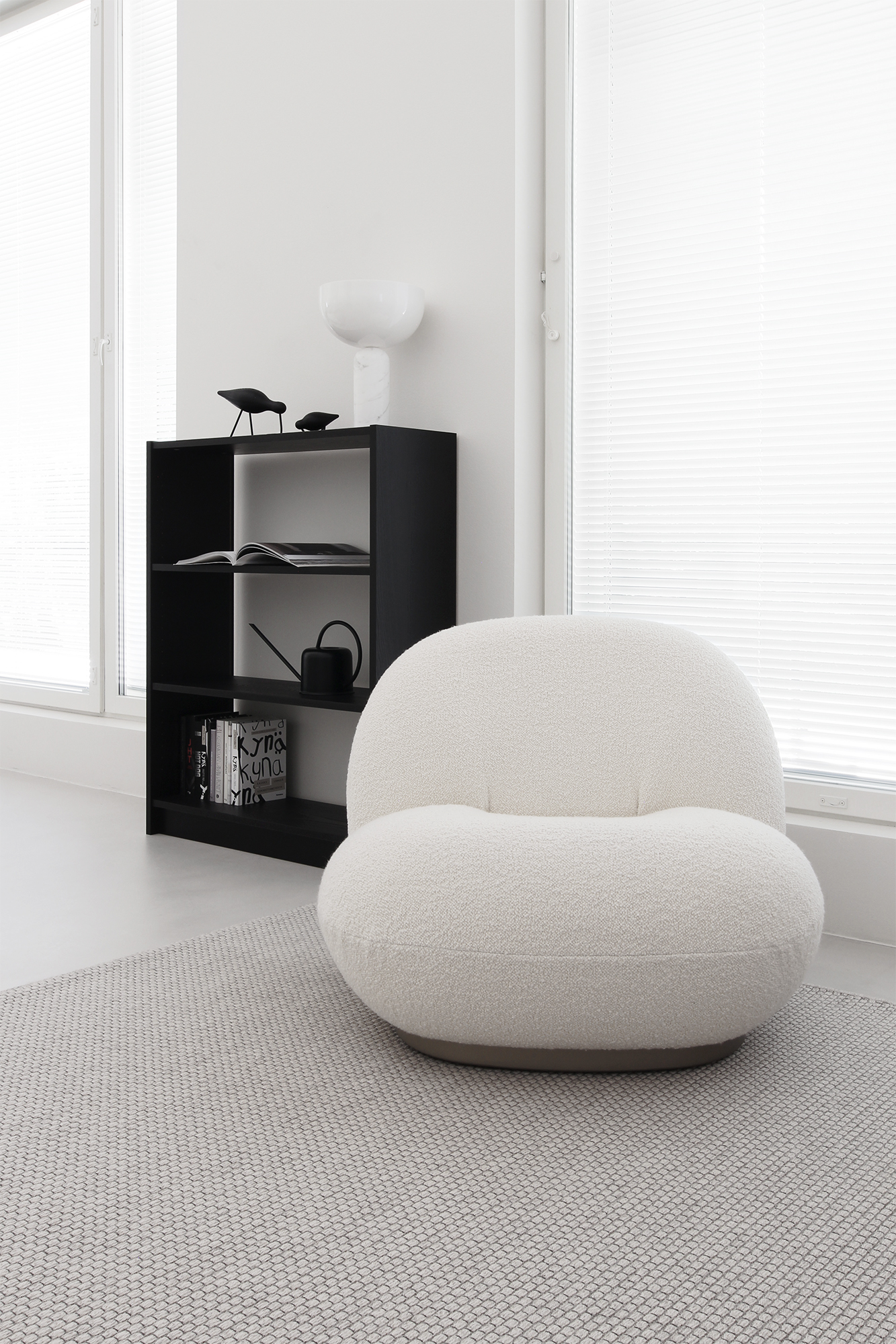 Lapset kutsuvat Pachaa lammastuoliksi. Arvatkaa vaan, miten siitä tapeltiin ensimmäisinä päivinä. Siihen oli jonoa! Piti jakaa pojille omat vuorot, milloin kukakin saa siinä istua, niin suosittu uusi tulokas oli. Koska tuolissa ei ole käsinojia, mahtuu se helposti pienempäänkin tilaan ja vaikka keskelle huonetta. Tykkään ihan älyttömän paljon Pachasta, sen yksinkertaisen ajattomasta muotoilusta, pyöreydestä, jalasta, kankaasta – you name it. Vaikkei sille suoranaista tarvetta aluksi ollutkaan, tulee se olemaan vielä todella kovassa käytössä. Ehkäpä siis joudun myöhemmin pyörtämään sanani.