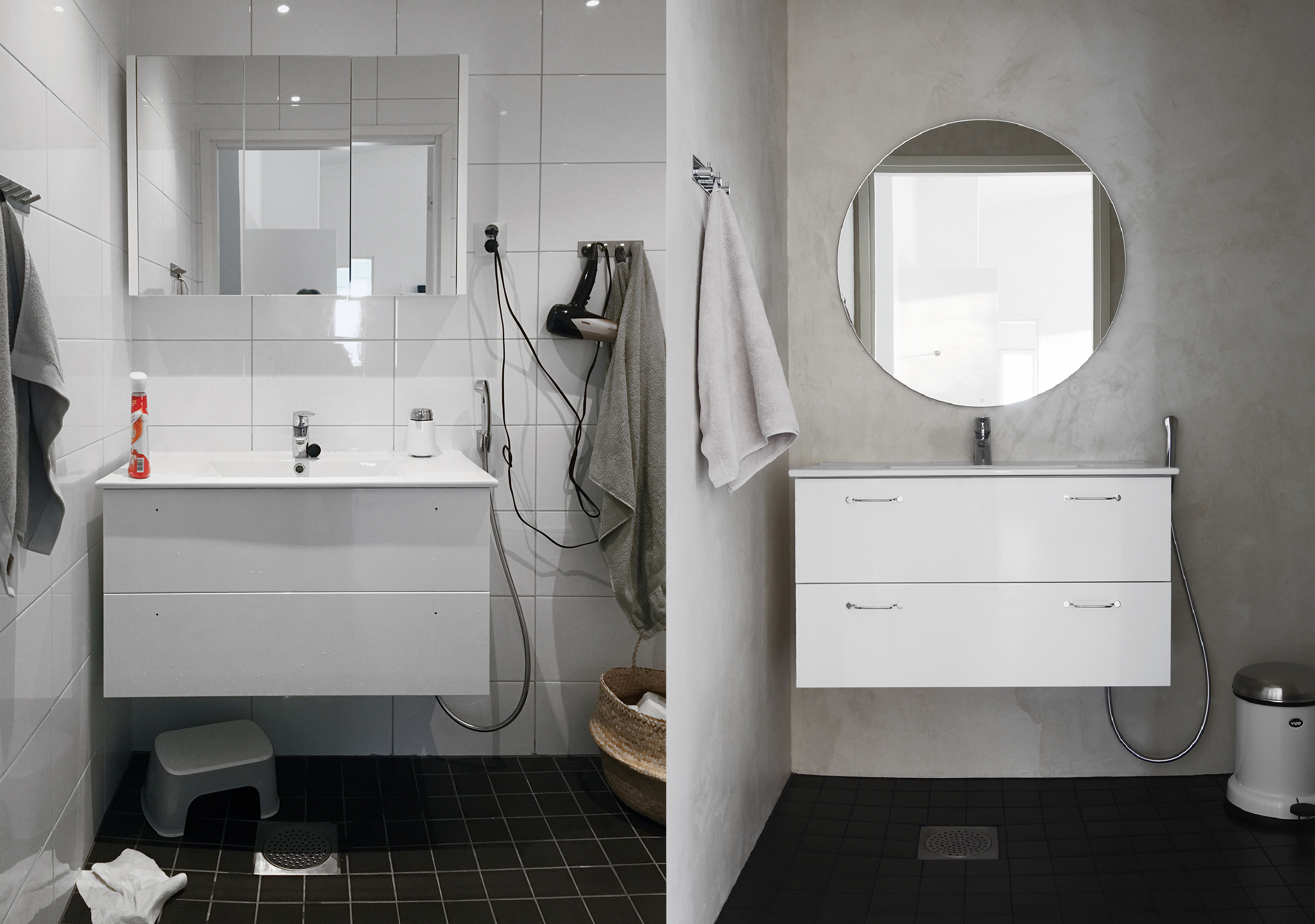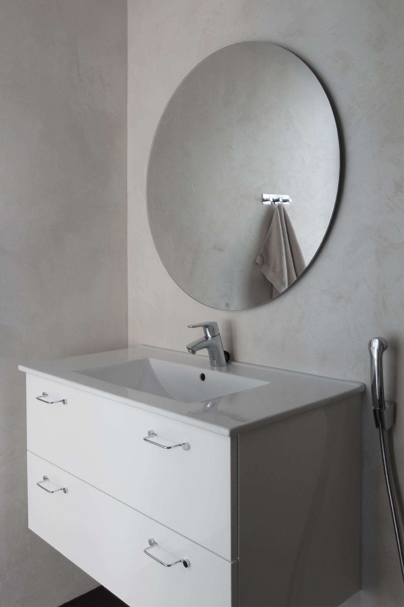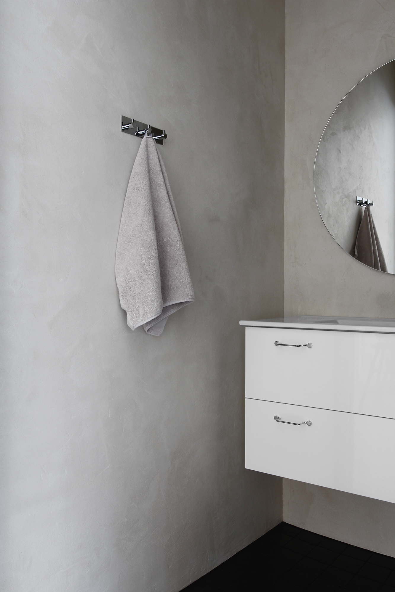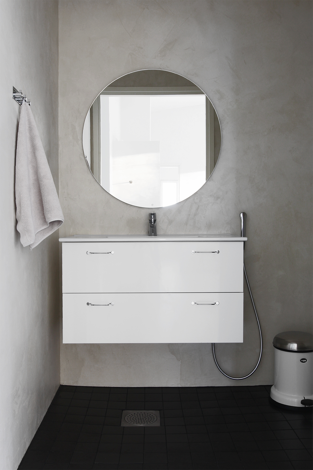 Kun seinät oli valmiina, allaskaluste asennettiin takaisin ja samalla sitä siirrettiin hitusen keskemmälle irti seinästä, jotta siivoaminen olisi helpompaa. Siirron takia vesiputkiin piti tehdä pientä säätöä, jonka putkari hoiti. Peilikaappi vaihdettiin isoon pyöreään peiliin ja harmaat pitkät vetimet Superfrontin kromisiin kaunokaisiin. Hommasin vielä uuden kromisen naulakon ja vessapaperirullatelineen.
