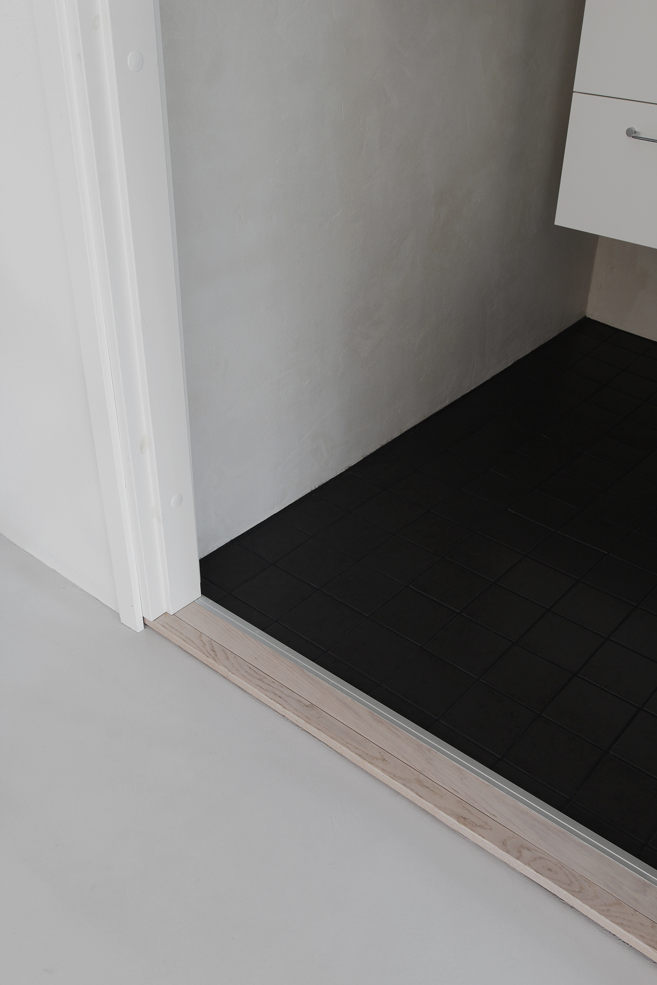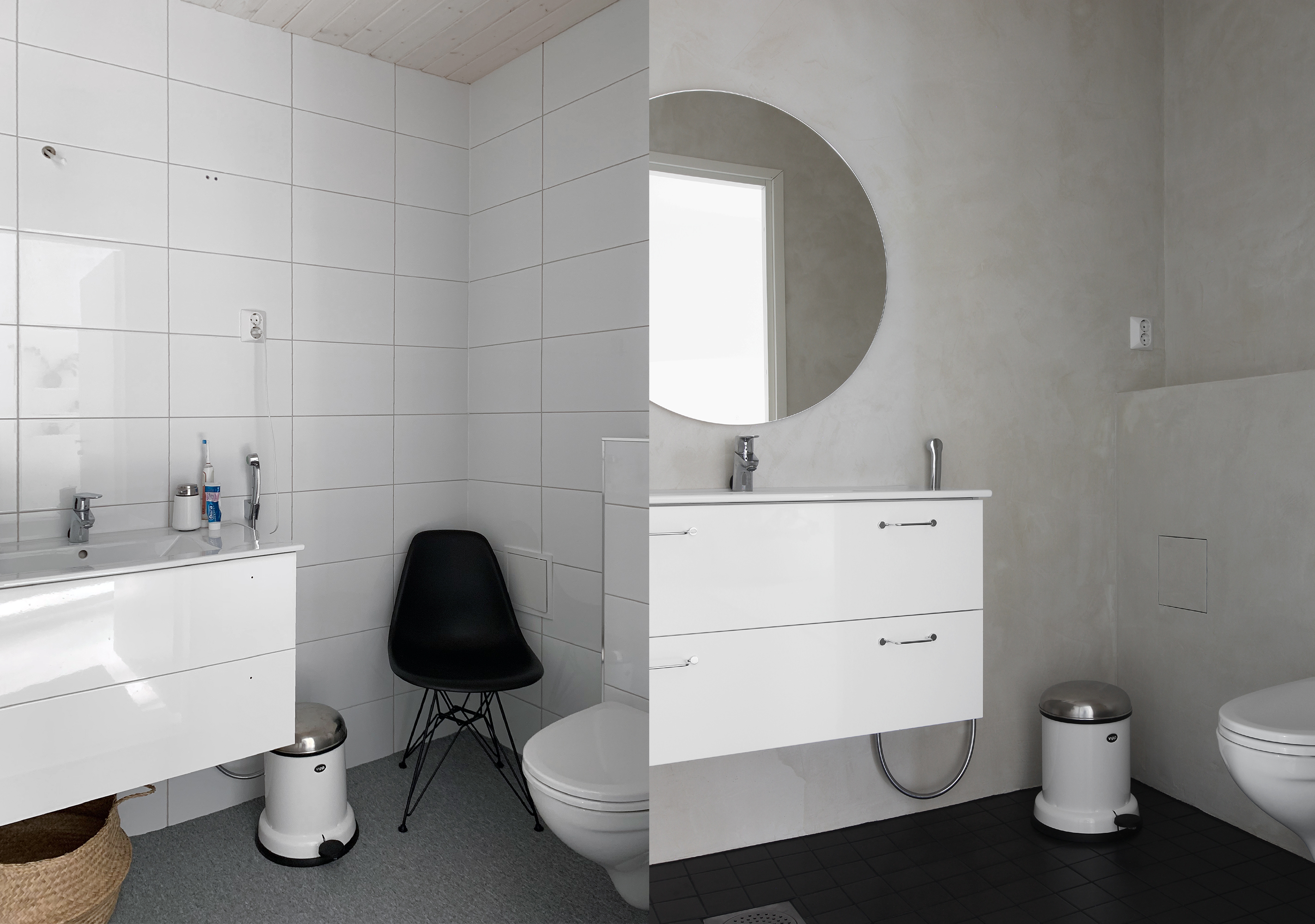 Vessa oli puolestaan tavanomaisen ilmeen lisäksi epäkäytännöllinen. Halusin siitä selkeämmän, toimivamman ja yksinkertaisemman. Kysyin tarjouksia laatoituksesta sekä mikrosementoinnista, jotka olisi tehty suoraan laattojen päälle rikkomatta vedeneristyksiä. Hinnat hipoivat useita tonneja, joten oli keksittävä muita vaihtoehtoja.