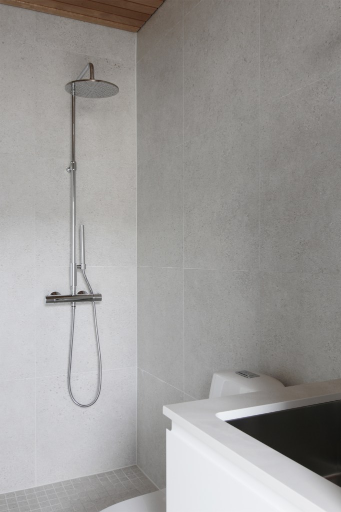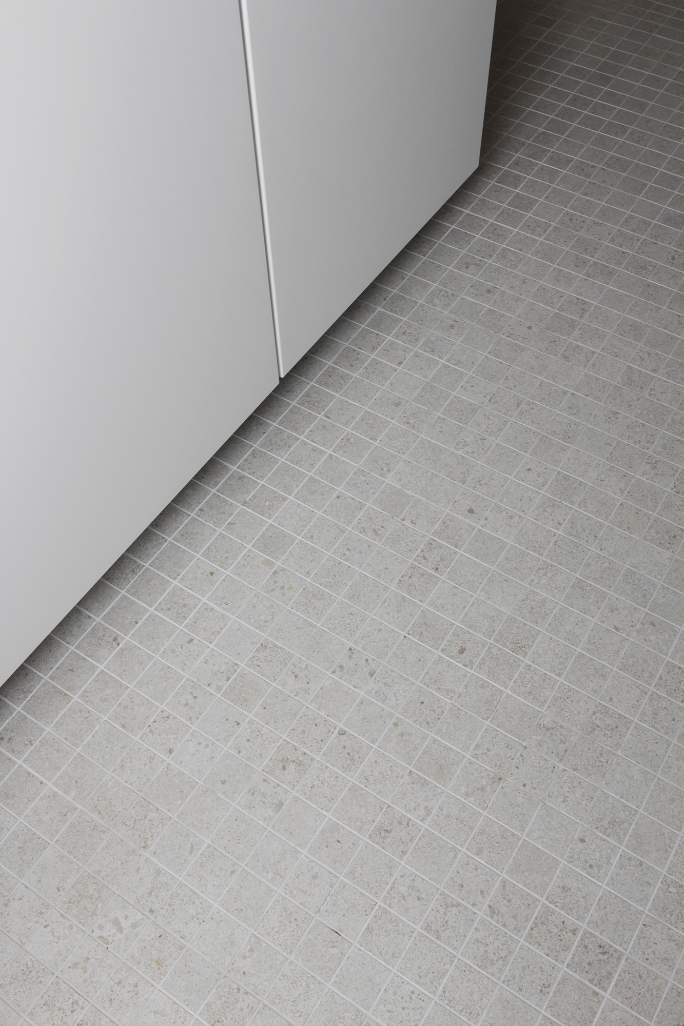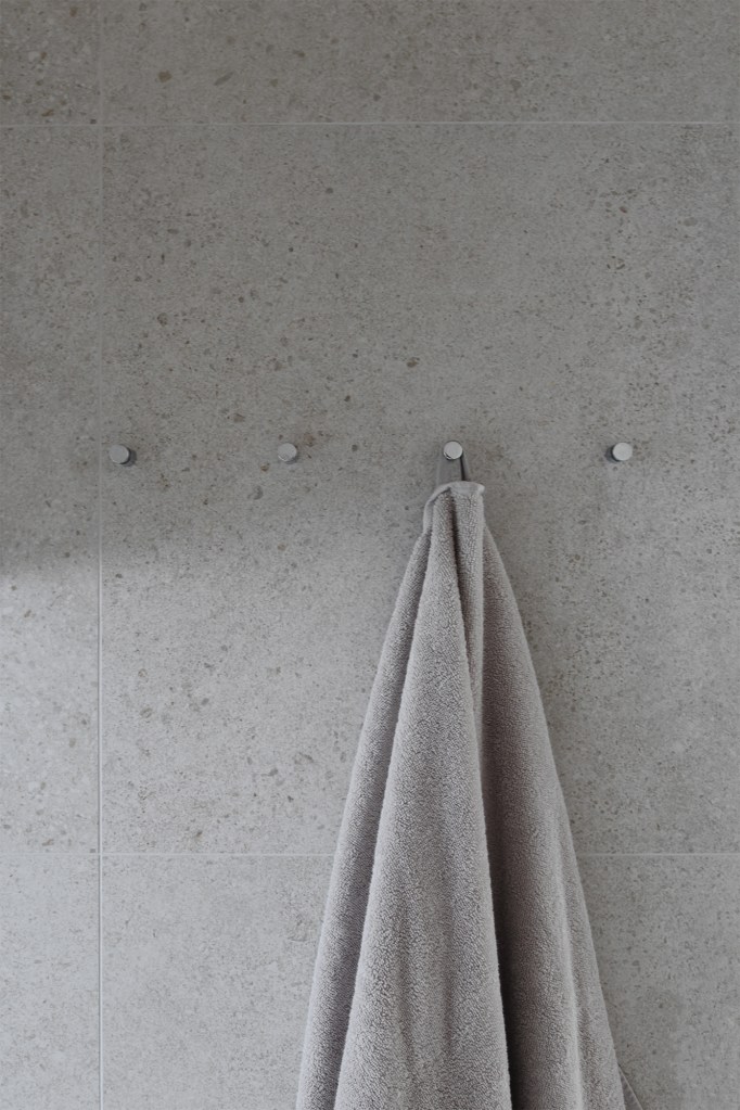 Olen erittäin tyytyväinen tekemiini valintoihin kylpyhuoneen osalta. Tällaisessa pienessä asunnossa isot seinälaatat toimii kivasti tehden ilmeestä yksinkertaisen, kun taas pienet mosaiikkilaatat lattialla mukailevat kaatoja, jotka on tässä asunnossa tehty erinomaisesti.