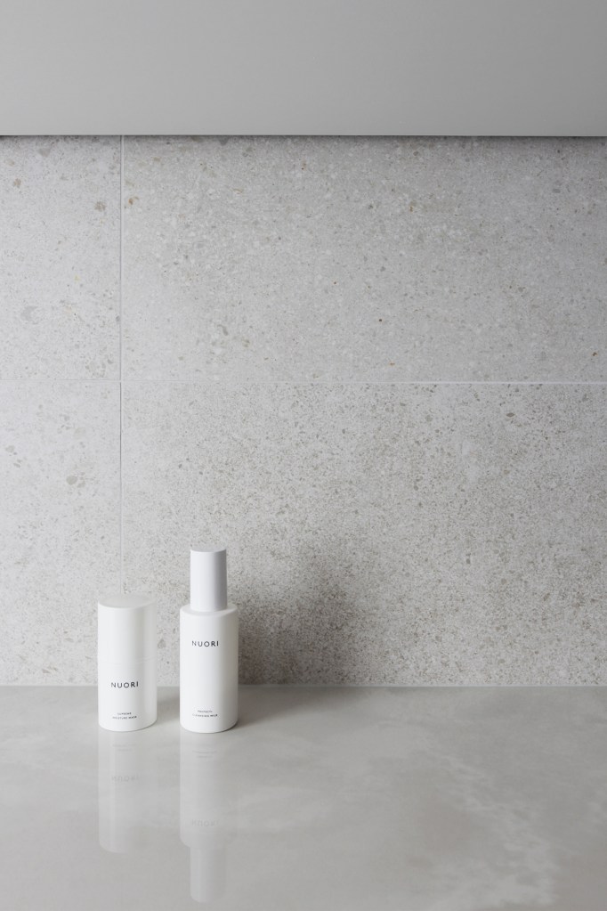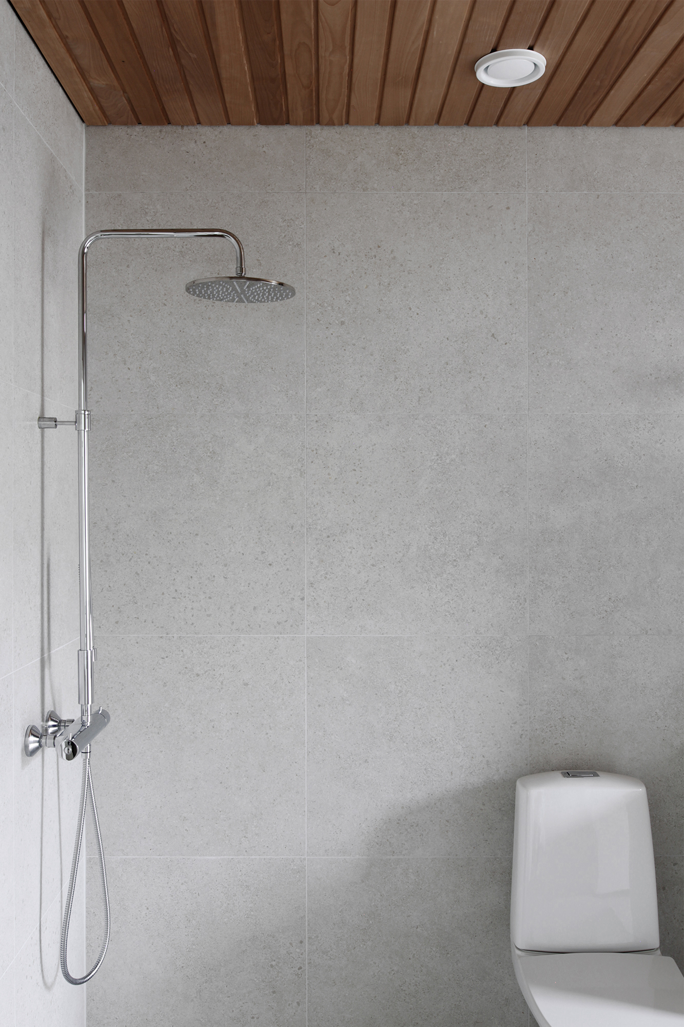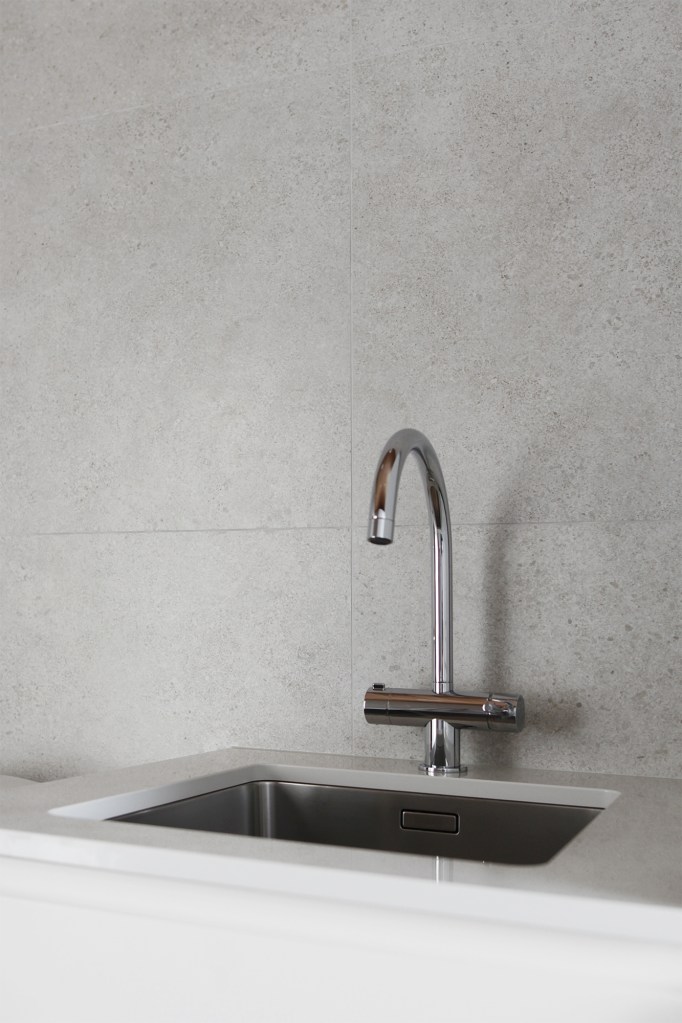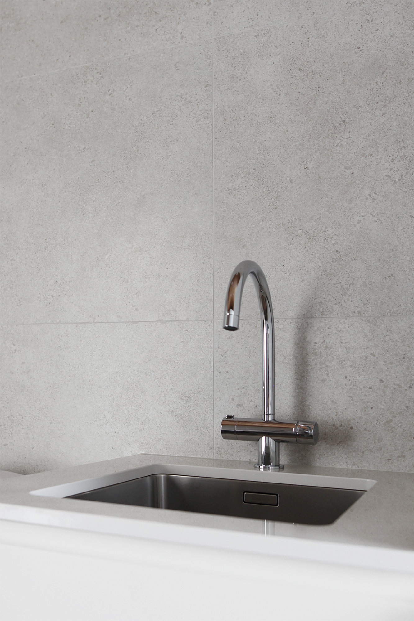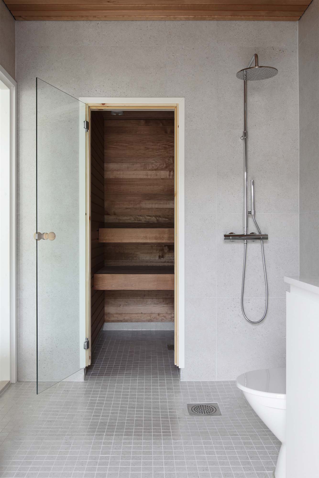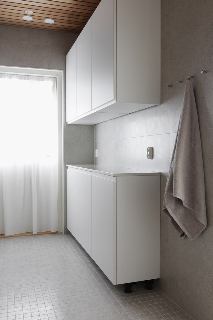 Vaaleat Deep Sugar -laatat tekivät kylpyhuoneen ilmeestä pehmeän raikkaan. Kaappien väriksi valitsin vitivalkoisen, joka tuo sopivaa kontrastia, soljahtaen kodinkoneiden ja teknisten laitteiden kanssa yksiin. Kylpyhuoneen kattoon laitettiin lämpökäsiteltyä haapaa, joka on samaa kuin saunassakin ja näin tilaan saatiin jatkuvuutta. Kromiset yksityiskohdat viimeistelevät ilmettä.