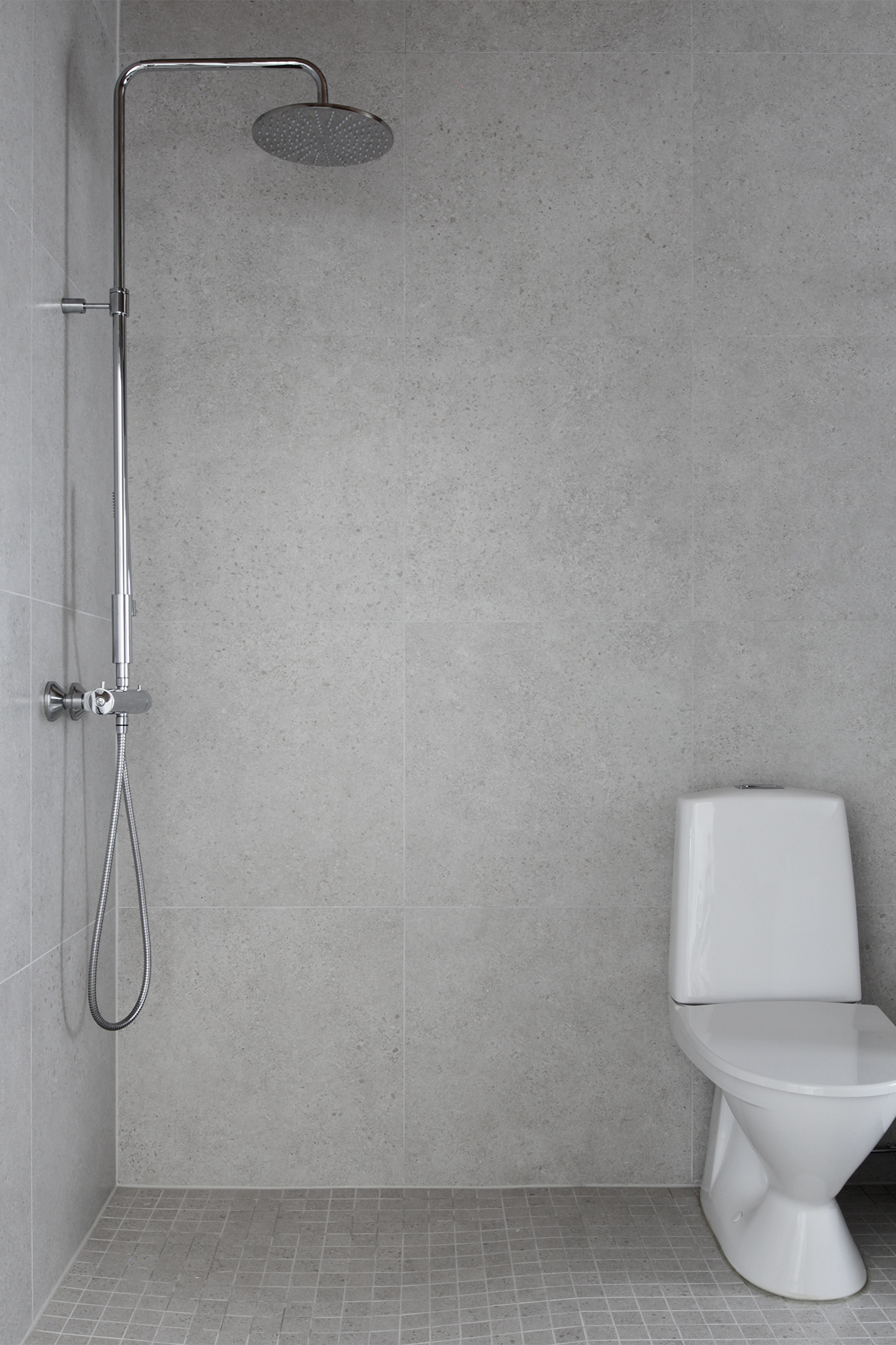 Seinälaatoiksi valikoitui Pukkilan mattapintainen Deep Sugar 60 x 60 cm koossa ja lattialaataksi sama, mutta 5 x 5 cm kokoisena. Halusin, että saumat häivyttyvät mahdollisimman hyvin, joten saumalaastiksi valitsin Weberin Marblen ja saman sävyn myös silikoniin.