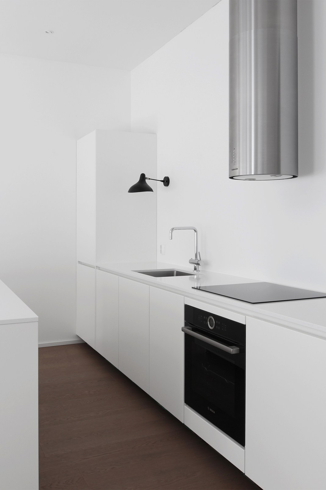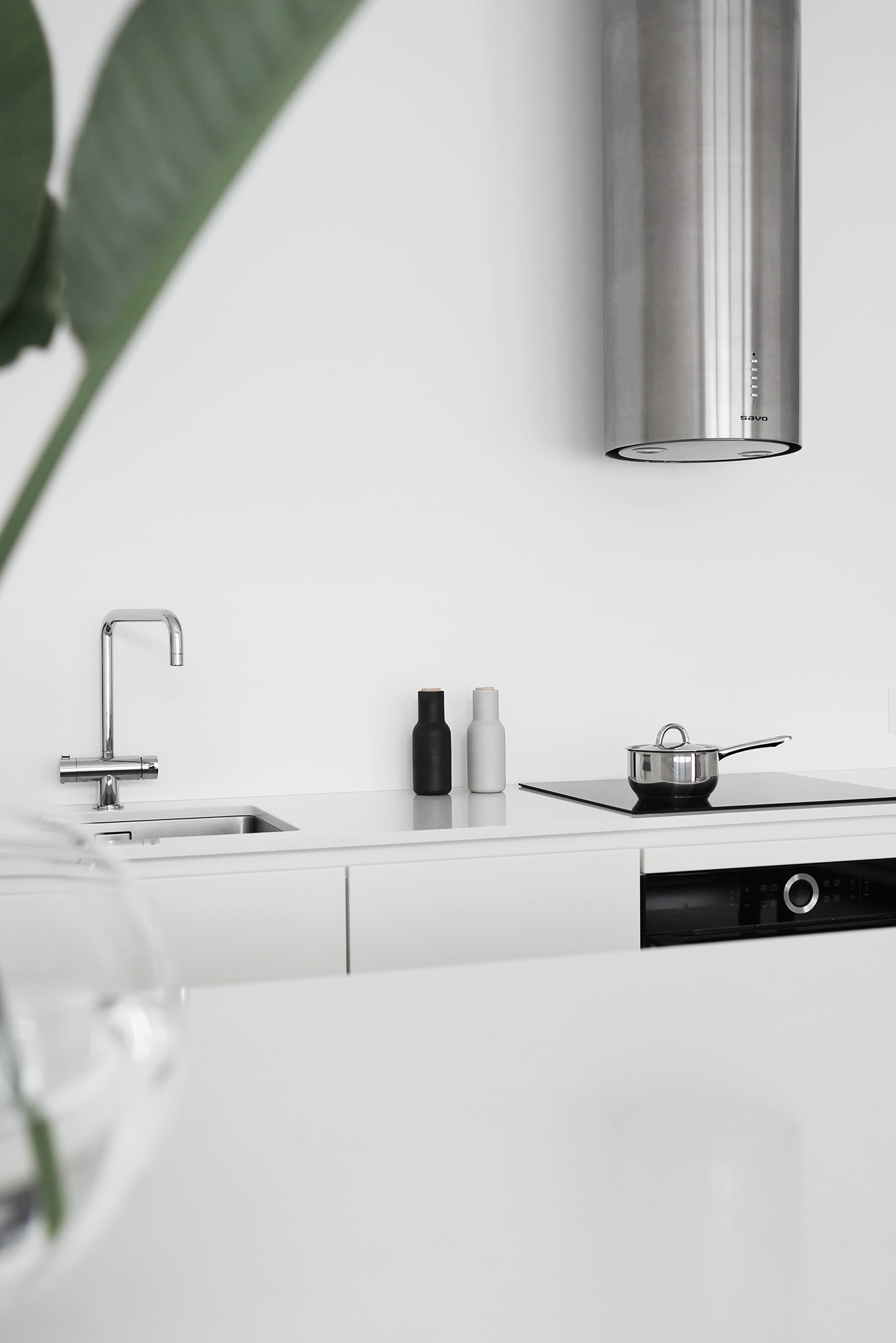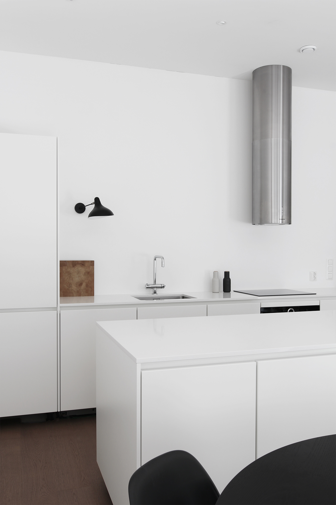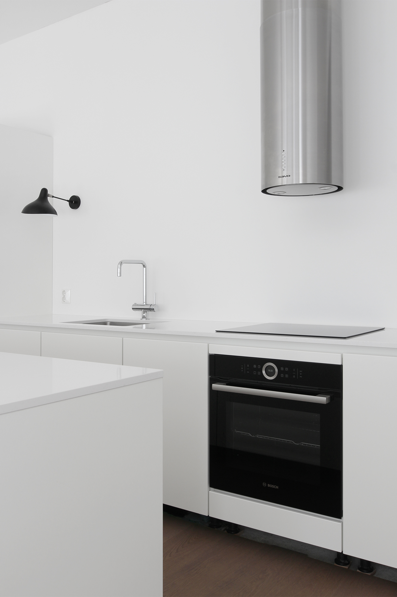 Olen ihastellut Bora Purea, joka on induktiotasoon integroitu liesituuletin. Borasta onkin tullut melkoinen hitti ja tuntuu, että se on järjestäen jokaisella, joka on viime aikoina rakentanut tai remontoinut. Itsekin sitä pohdin, jotta olisin saanut pidettyä tilan avarana. En halunnut saarekkeeseen kuitenkaan mitään toimintoja, en sähköä enkä vettä. Uunin toivoin olevan samassa linjassa induktiolieden kanssa, joka ei Boralla olisi onnistunut, kun se vaatii tilaa alleen.